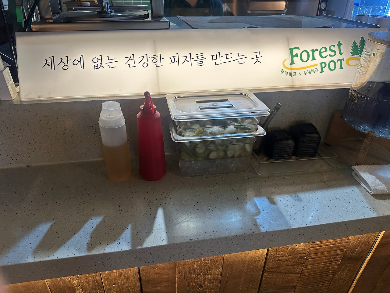 물과 피클은 셀프. 꿀과 케첩도 준비되어 있다. 피자와 꿀은 진짜 꿀 조합!