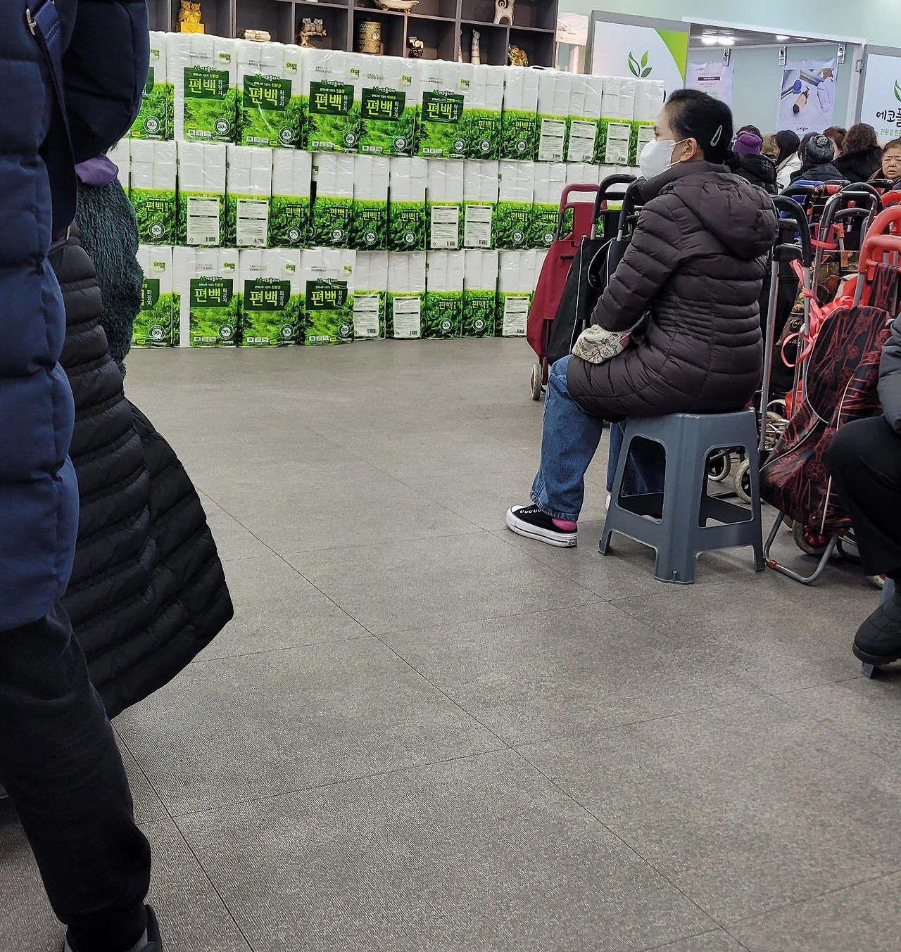 다음날까지는 와야 하니 미리 2천 원을 내고 30cm 프라이팬을 5분 만에 받아 나왔다. 이튿날 30개들이 휴지 뭉치를 들고 오는 데는 한 시간이 소요됐다. 600명 운집해야 하는 장소에 700명 이상이 왔으며 판매업자의 영업적인 말투를 듣고 나와야 해서다. 정말 남자분은 한 사람도 없었으며 역시나 아줌니들 입술에 바르고 마후라 두르고 시장 보러 가는 것보다 몸치장을 했다.