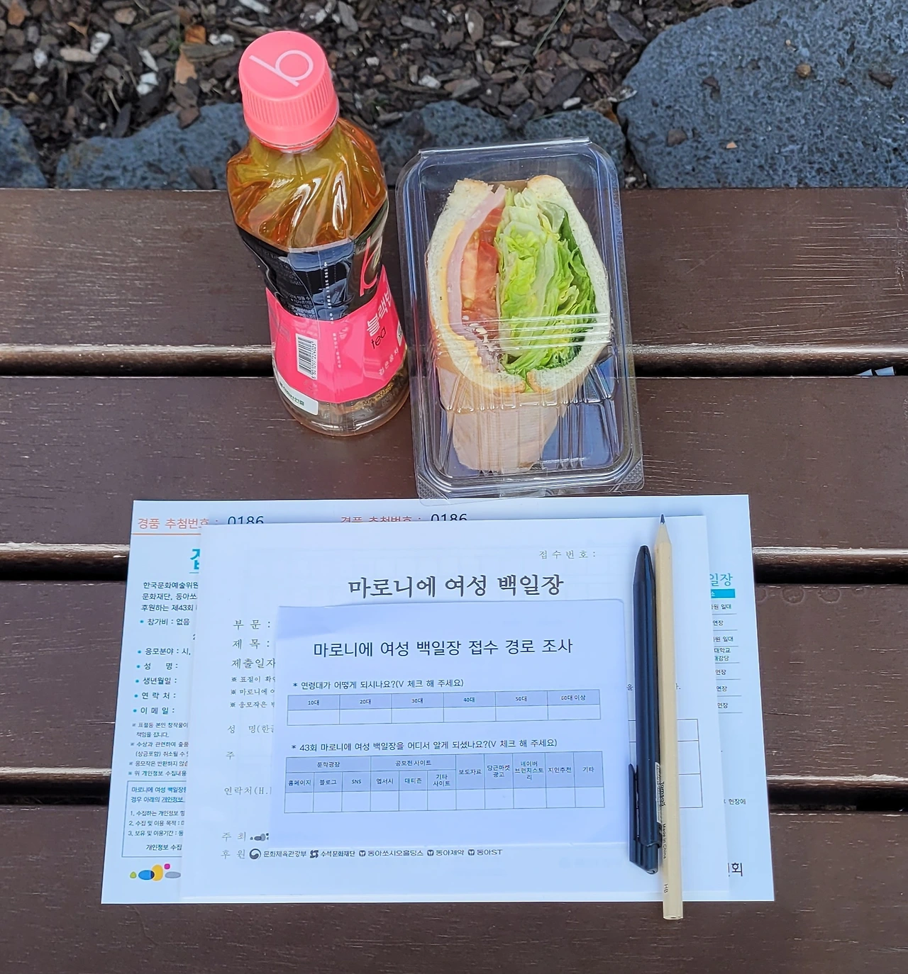 * 박카스를 제조하는 동아제약에서 시행한 43회 마로니에 여성 백일장에 참가하다. 서비스받은 물품. 인천 새얼 백일장에선 인파가 많아서인지 음료조차 제공받지 못했었다.