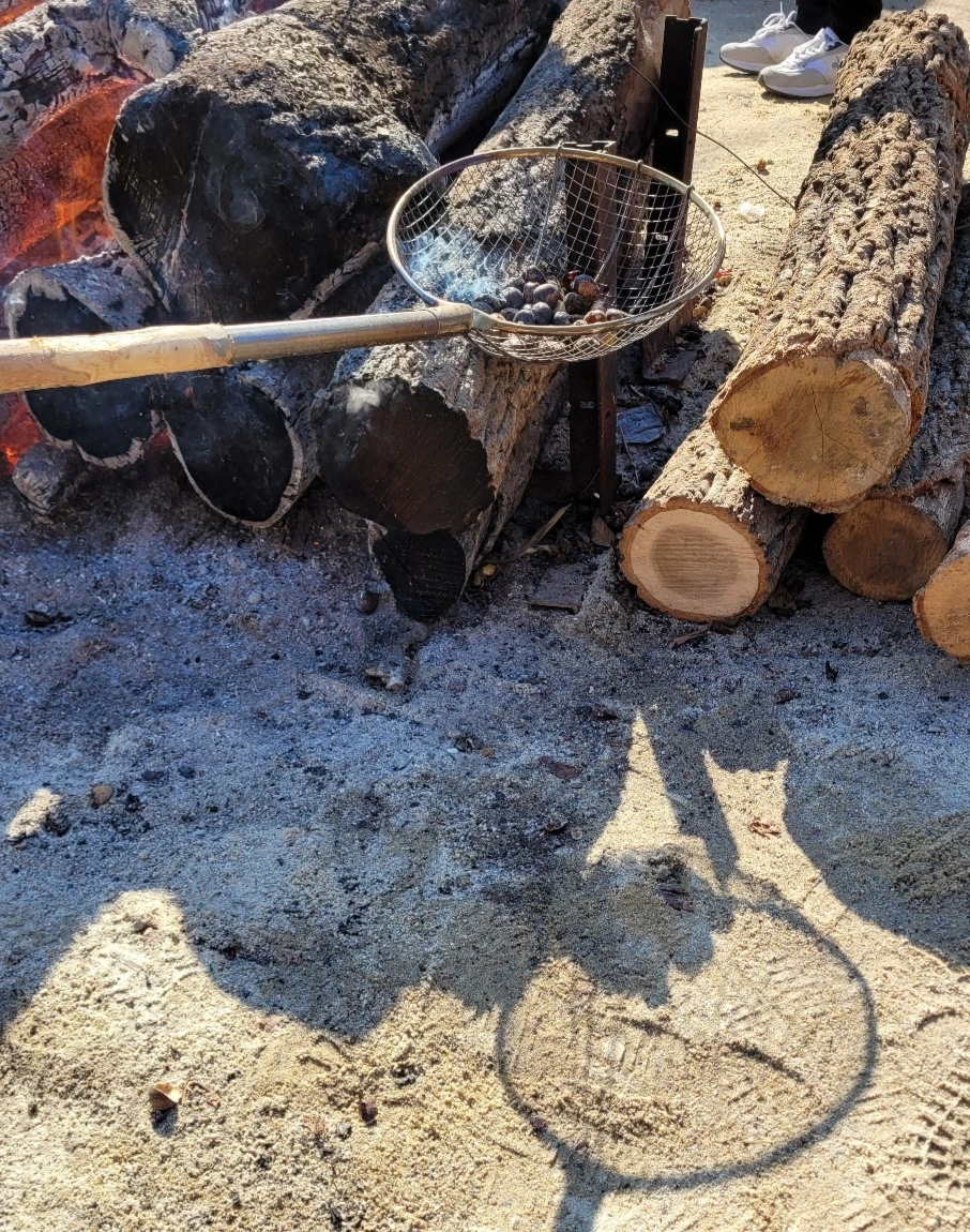 한쪽 양지바른 곳에선 한 봉지 오천 원 하는 군고구마를 샀는데 저희가 첫 손님이라며 곱으로 세 개를 더 넣어 주셨어요. 이건 집에 가서 먹기로 하고 군고구마랑 같은 가격인 밤을 한 봉지 사서 굽기로 했어요. 굵은 통나무 새로 밤이 담긴 바구니를 흔들거려 주는데 껍질이 새까맣게 탈 정도로 돼야 익습니다. 맛은 밍밍합니다. 날짐승이 버려진 것을 쪼아 먹으러 오질 않는 걸 보고 높지 않은 길을 내려와서 파스타집에 들렀어요. 따끈따끈하니 고소하고 짜지 않아서 좋았습니다. 서양에 와서 먹는 기분이 났습니다.