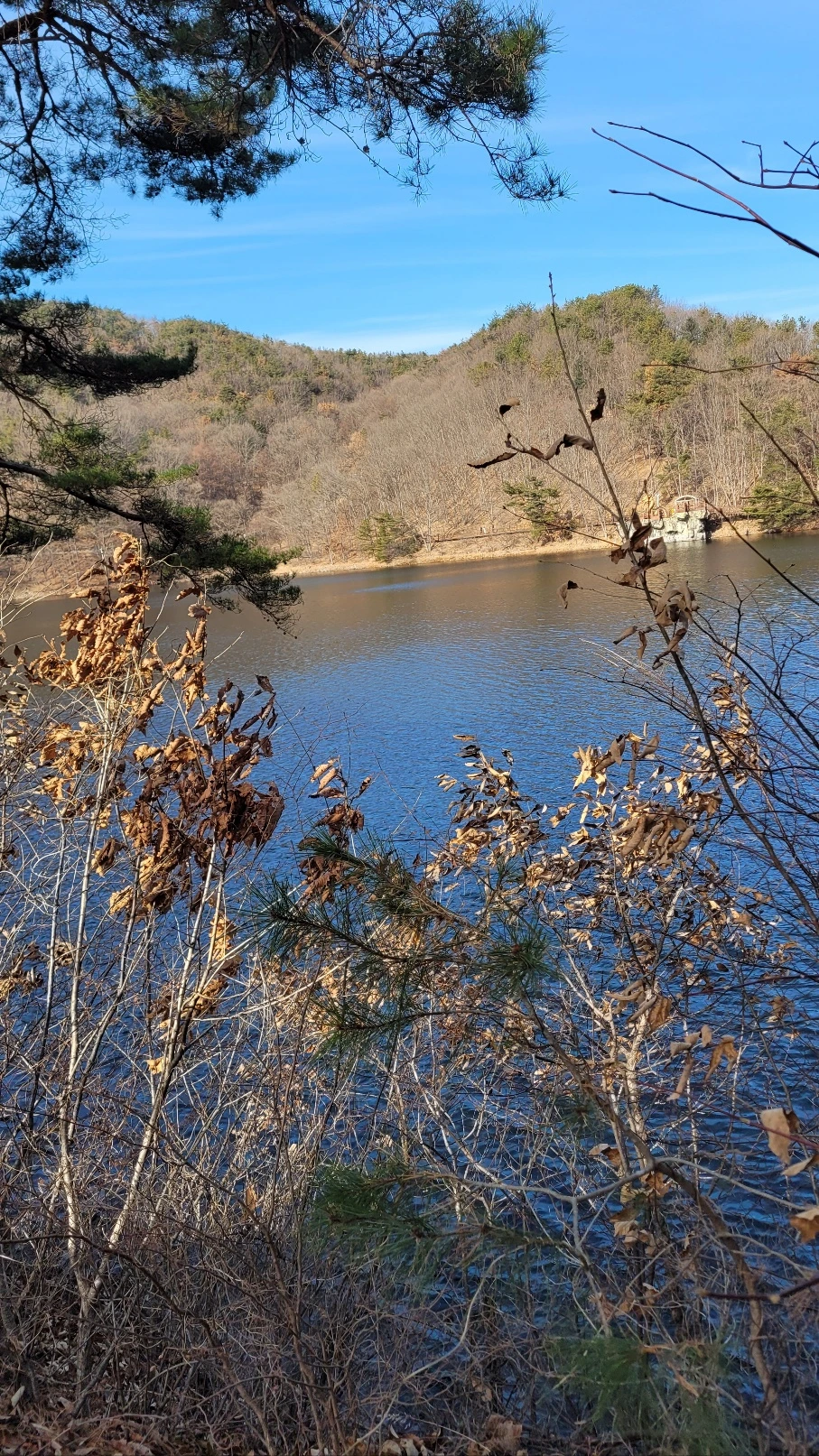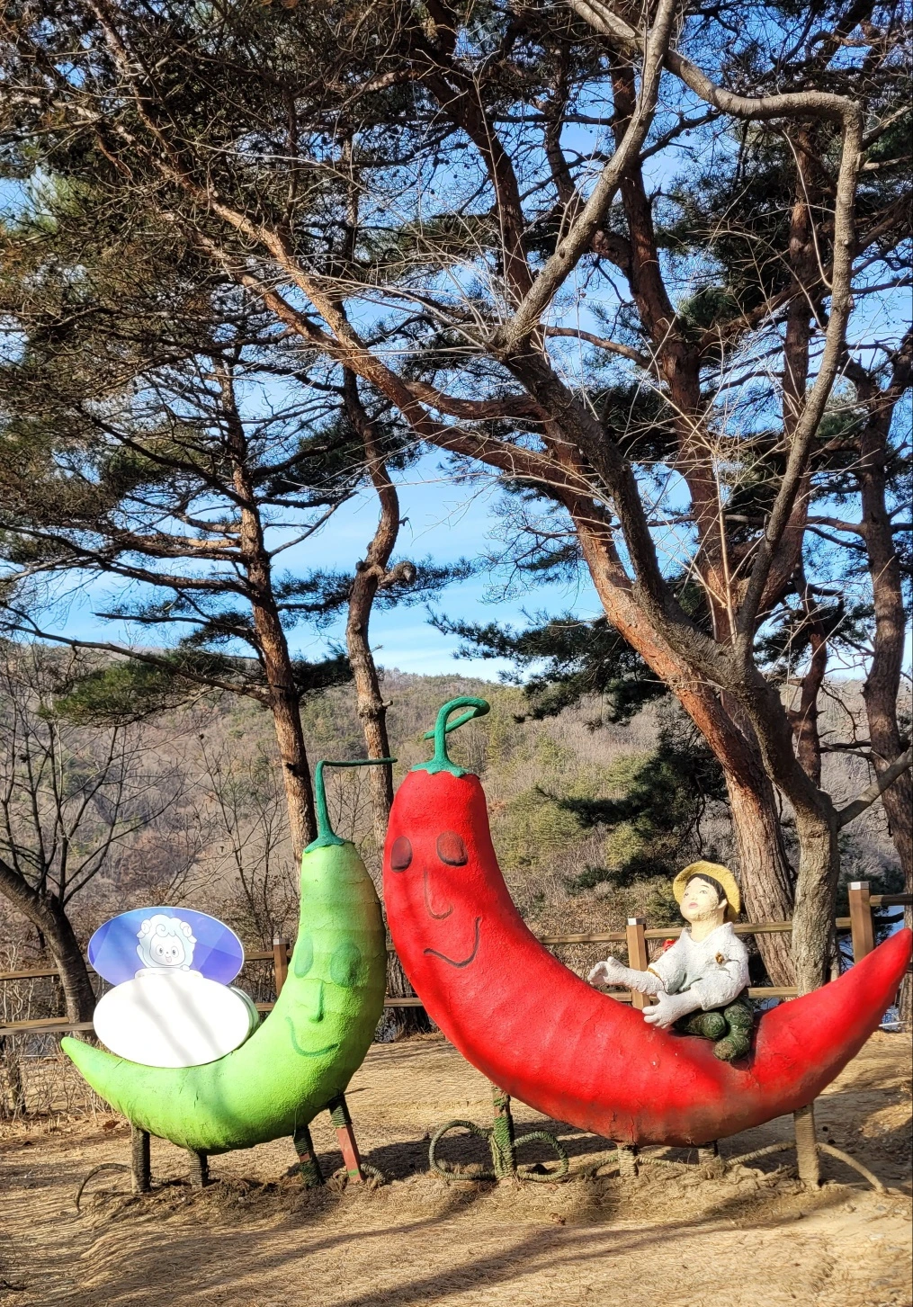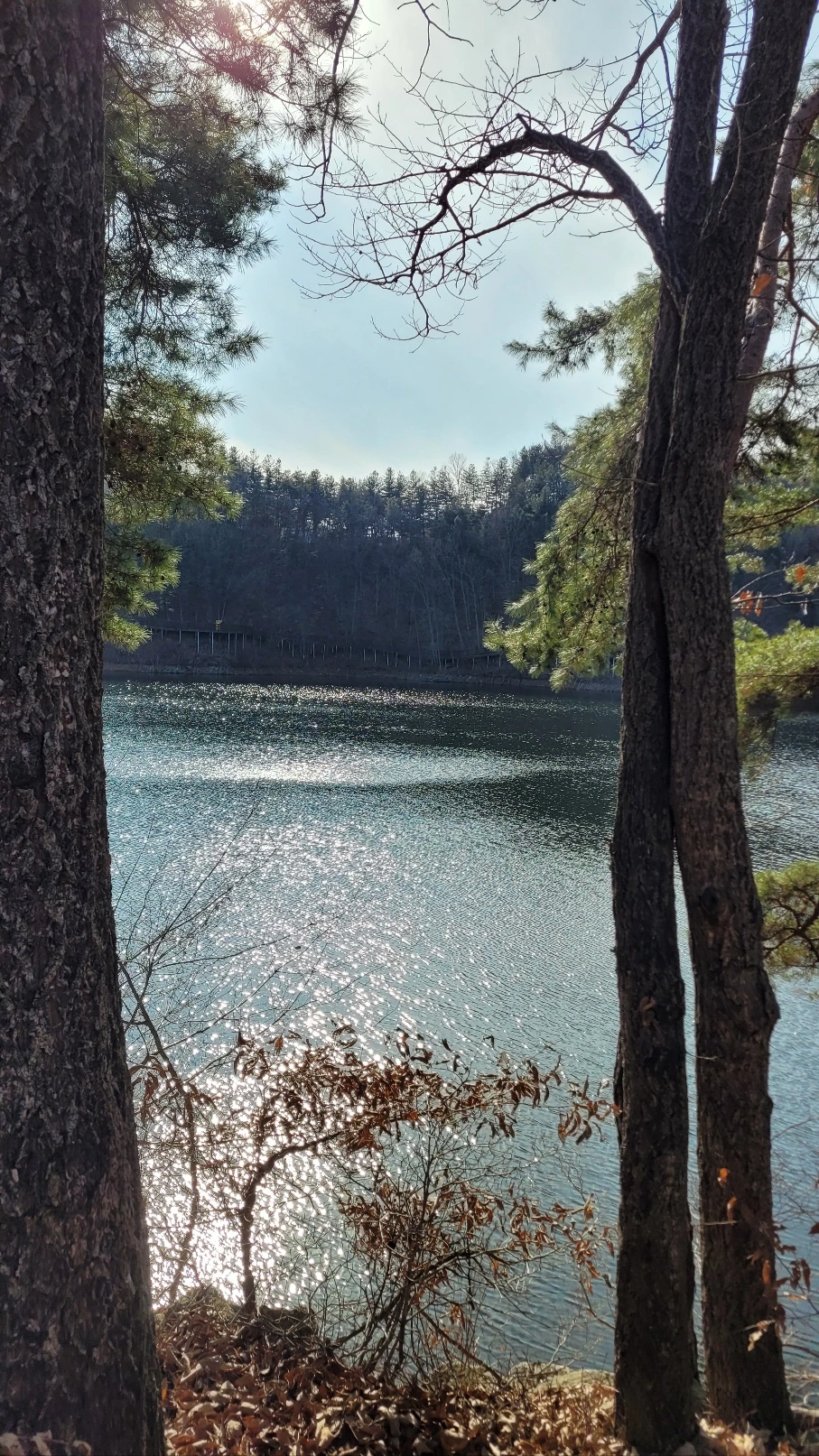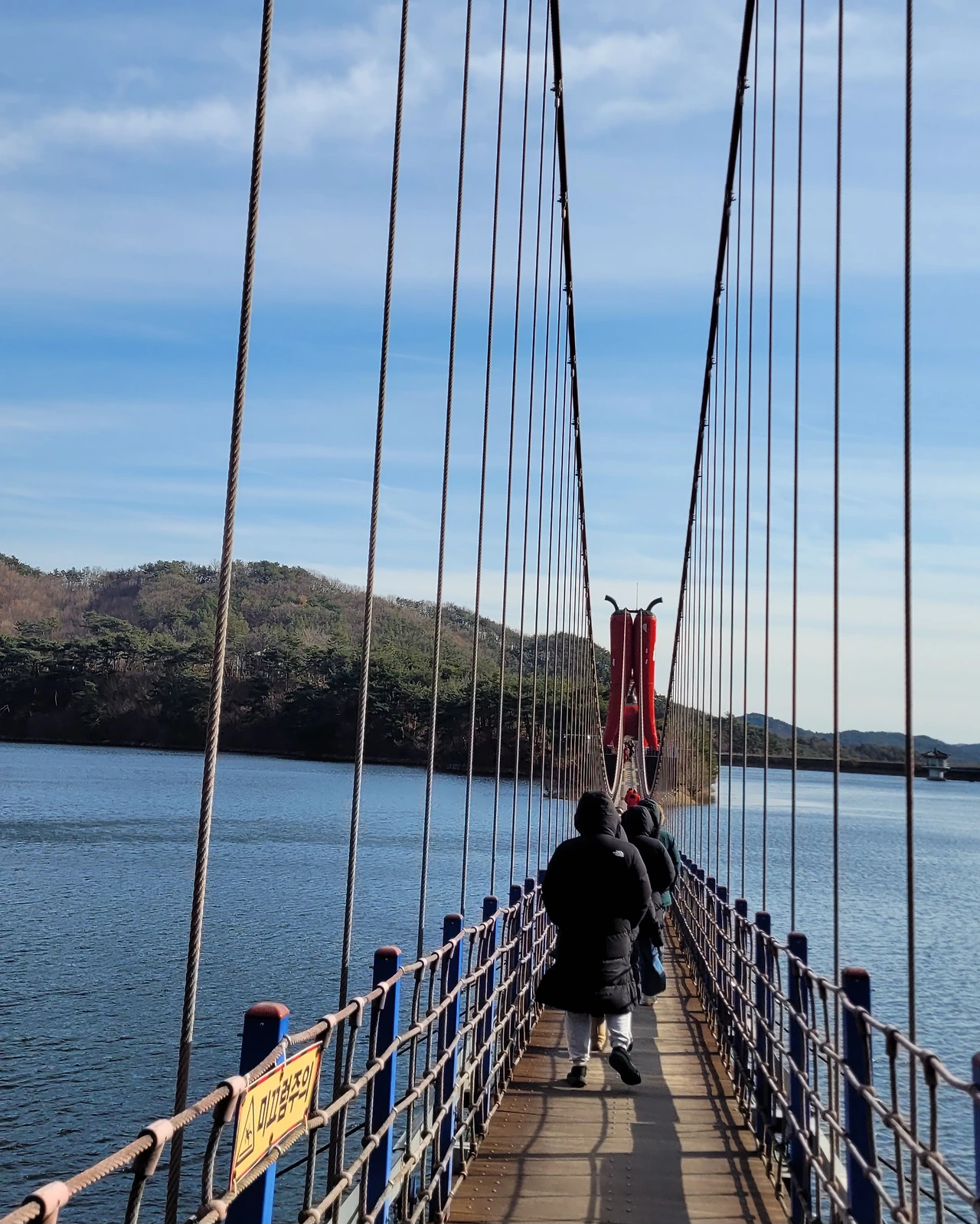 허기를 따뜻하게 데웠으니 가벼운 발걸음으로 햇살의 온기를 받아 가며 출렁다리를 걷습니다. 파주의 출렁다리보다 아주 약한 미동은 어린 아기들도 호기심 가득 즐겨보라고 걸쳐놓은 다리 같았지만 다리 밑의 양쪽으로 파랑과 둔탁한 옥빛으로 나뉜 물결은 물고기 비늘이 계속 춤을 추는 것 같아 눈부셨어요. 호수가 아주 맑았답니다. 고추와 구기자로 유명한 곳인데 냉랭한 겨울 평일이어서인지 사람들이 붐비지 않아 공기는 더욱 청정했지요.
