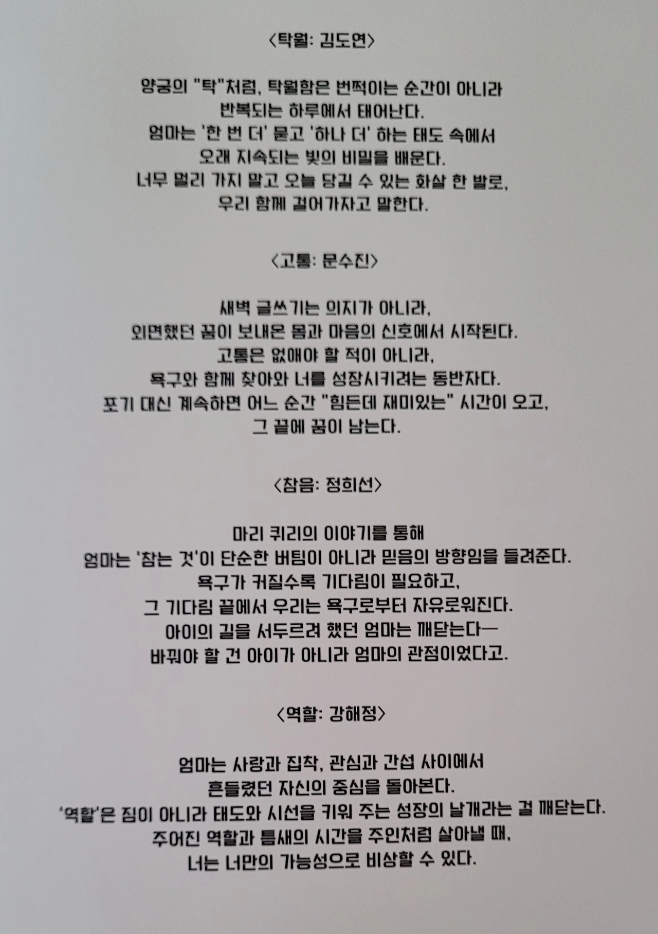 여섯 작가님의 ‘아이야 너는 너로 살아라’라는 취지로 시작되는 엄마의 편지는 먼저 책에서 습독한 바와같이 젊은 엄마들이 읽어보면 참 좋겠다는 생각을 가졌다. 엄마는 아이한테 또 다른 우주를 향해 딛게 되는 걸음을 축복해 주고 응원한다는 뜻을 담았는데 나는 잘 성장해 준 아이한테 고맙다고 말했다. 엄마의 유산은 물적 재산이 아닌 정신적인 에너지를 건네주는 의도가 좀 다를 수 있으나 나는 서슴지 않고 목을 매어가며 객석에 앉아 지담작가의 물음에 엉뚱한 대답을 했는지도 모른다. 독립성을 키워주고 네가 택한 길을 엄마는 응원을 보낸다는 철학적인 취지는 분명한데 나는 그저 잘 성장해 줄뿐더러 이제는 나를 되려 염려해 주고 케어해 주는 것에 미안하고 고맙기 짝이 없을 뿐이다.