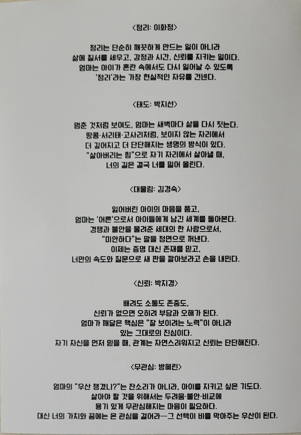 연극에 한참 빠졌던 내가 가장 가슴에 담고 있는 장면은 ‘콩쥐팥쥐’이며 정신없이 통곡하듯 애끓게 본 것은 ‘친정엄마와 2박 3일’이었다. 그리고 엄마의 유산팀의 ‘아이야 너는 너대로 잘살아라’ 편지극 역시 엄마와 관련된 메시지를 전한다. 나는 이번 극만 혼자서 객석에 앉아 있던 것이지 두 편은 친정엄마랑 둘이서 봤었다.