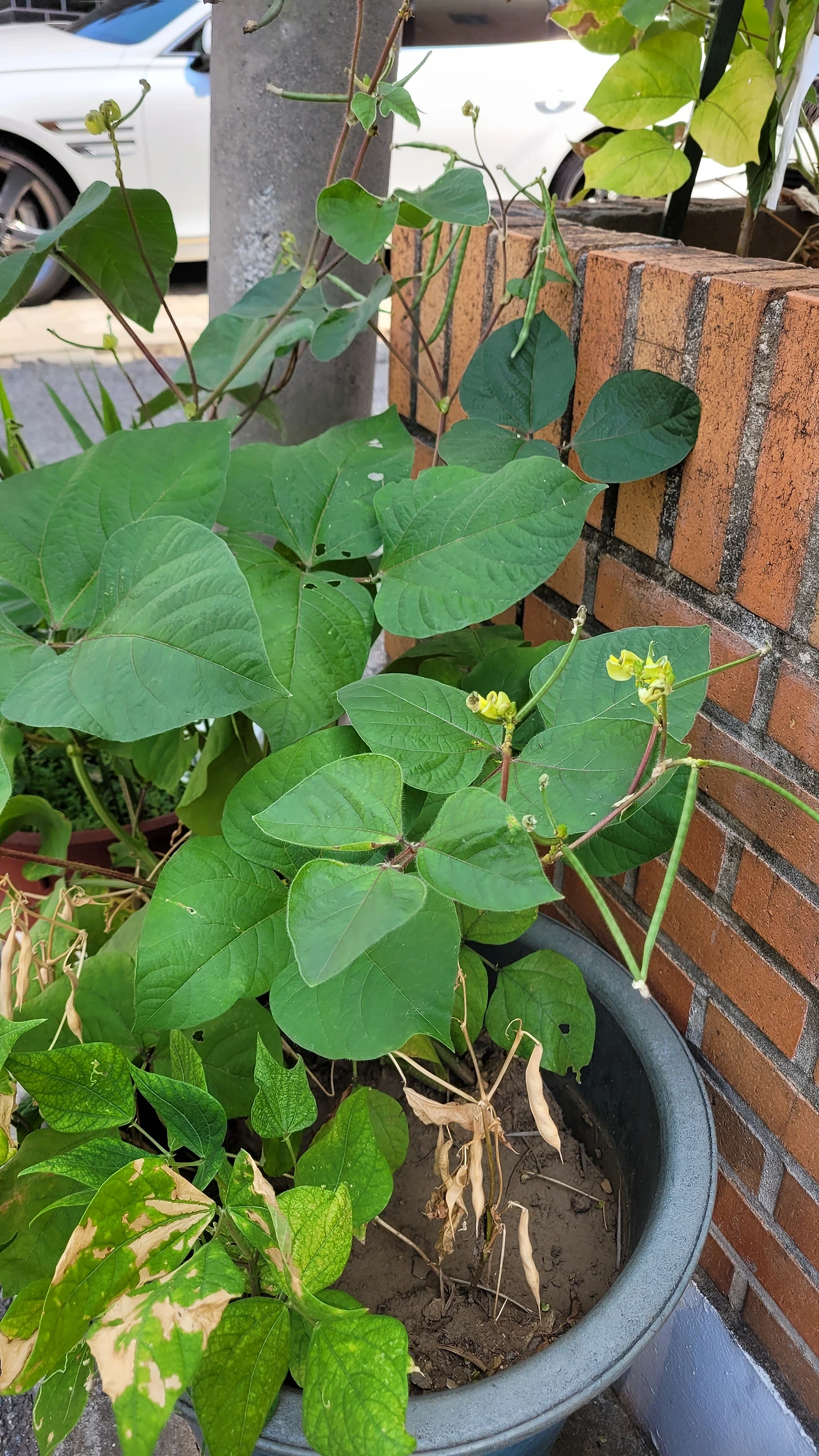 콩이랑 팥이 심어진 화분에서 콩깍지가 벌써 꼬투리를 벗겨달라고 초록빛과 대치하고 있다.