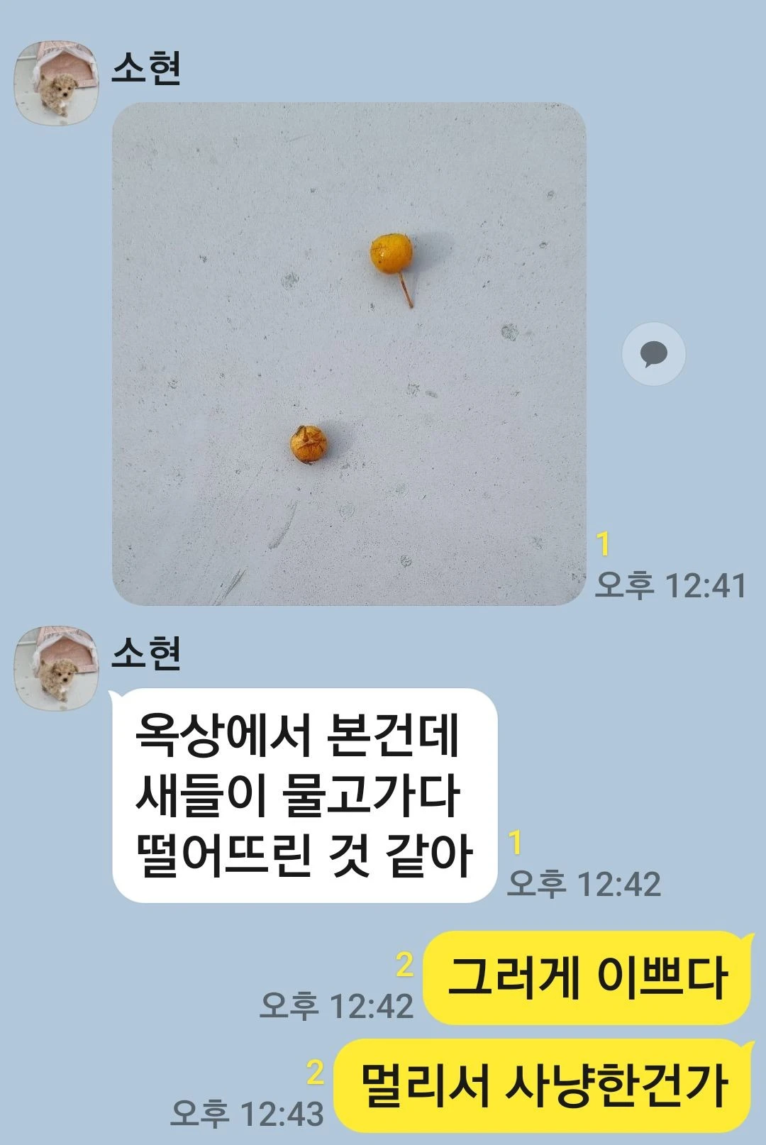 고요를 물어다 놓고 열매를 또 물어다 놨을까?조용했는데 눈에 띄었다. 새가 나는 것도 못 봤는데 상처가 살짝 난 열매는 가만히 누워있다. 그래서 공구리 세멘 바닥에 그대로 놔뒀다.