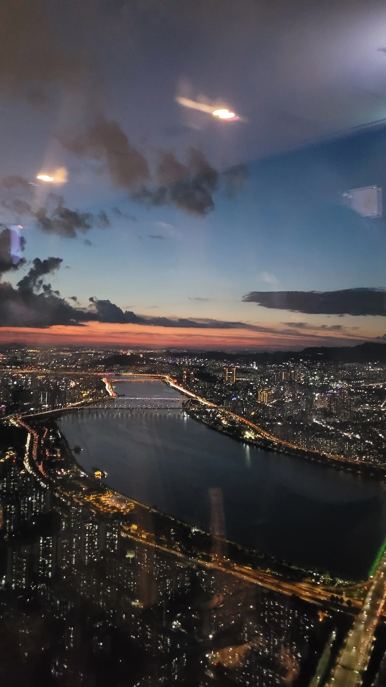 내가 더 많은 가을을 넘기기 전 감성이 풀풀 넘칠 때 못 가본 곳을 선정해 놓았단다. 그렇다. 난 그동안 일만 하고 세상 구경거리는커녕 동네 한 바퀴도 돌아보기 힘들게 시간이 빠듯했었다. 다리를 써도 좀 더 덜 힘들 때 정신 수양 떠나자. 말없이 쫓아왔는데 송파구 잠실동에 위치한 서울 스카이에 날 안내해서 지금 118층이다. 117층 엘베에서 내린 곳에선 스카이 데크 유리 아래쪽을 내려다보는 전광이다. 통창으로 보이는 뷰는 다 내 것 같다. 잠시지만. 성남과 구리 북한산 다 내다볼 수 있는 것이 가슴에 꽉 차게 들어와서 일게다.