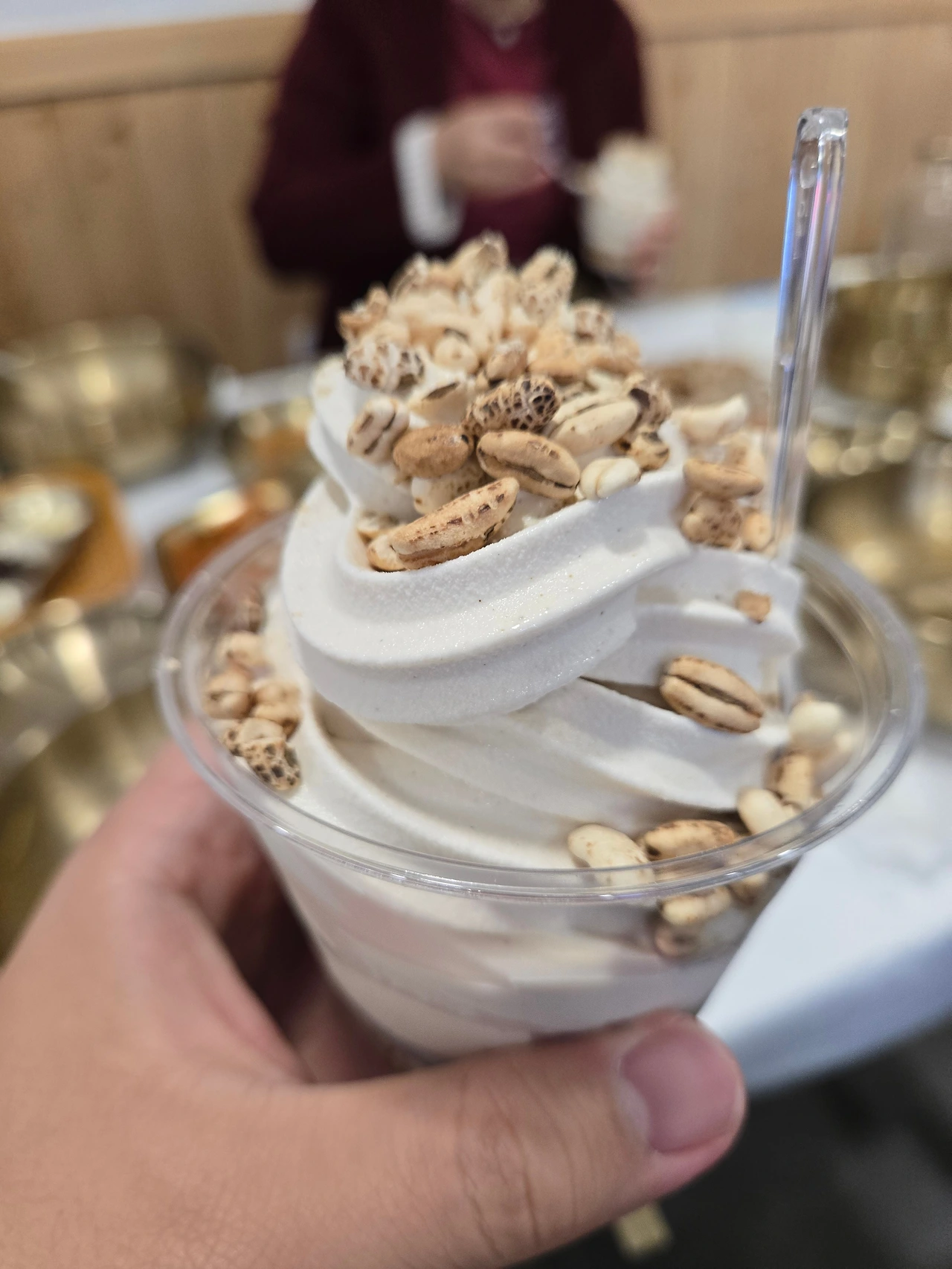 놋그릇에 담겨온 꽁보리밥을 나물 넣고 비비니 건강식이다. 이 중 취나물은 내 취향이어서 향에 반하고 맛에 반하니 딸내미한테도 권했다. 후식으로 1인당 2천원을 추가하면 보리 아이스크림을 듬뿍 한 컵씩 받게 되어 강릉의 특색일는지 보리밥 식당만의 일품인가 모르겠다. 아무튼 호식을 했다.