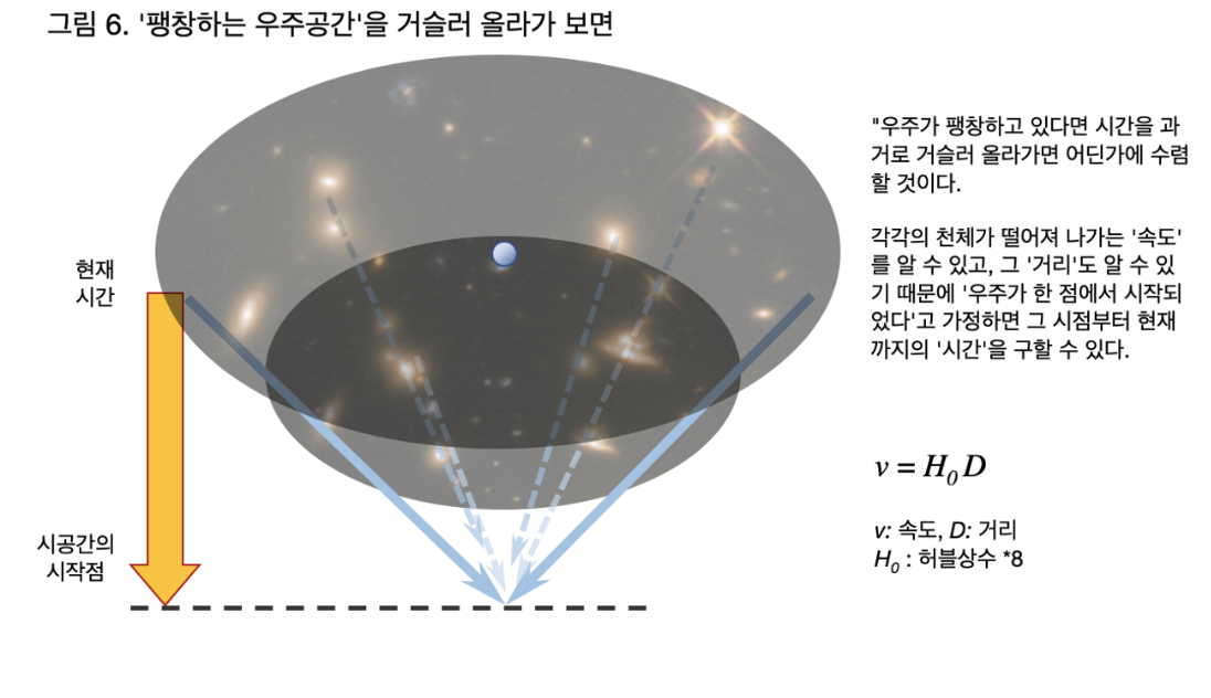 즉, 허블상수의 역수가 '우주의 시작 특이점에서 현재까지의 시간'임을 알 수 있다.