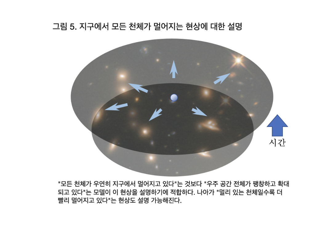 우주의 별들은 넓은 우주에 어느 정도 균일하게 흩어져 있을 것입니다. 각각이 독자적인 방향으로 운동하고 있다고 생각할 수 있지만, "모든 것이 한 점에서 멀어지고 있다"는 것이 가능할까요? 예를 들어 '큰 호수에서 수천 마리의 물고기를 관찰했더니 모든 물고기가 한 지점에서 멀어지는 방향으로 헤엄치고 있었다'와 같은 현상으로 생각할 수 있지만, 우연으로 이런 현상이 일어날 것 같지는 않습니다. 이를 설명할 수 있는 이론으로 '우주 공간 자체가 팽창하고 확대되고 있는 것 아니냐'는 모델이 제시되었습니다(그림 5). 확실히 '공간 자체가 팽창하고 있다'면 이러한 현상도 설명할 수 있습니다. 또한 '멀리 있는 천체일수록 빠른 속도로 멀어지고 있다'는 현상도 '우주 공간 자체의 팽창'을 뒷받침하고 있습니다.