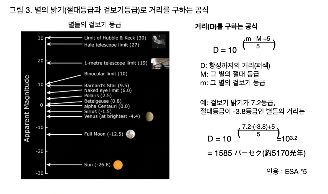 그 별의 '진정한 밝기(절대등급)를 알면, 지구에서 관측할 수 있는 밝기(겉보기 등급)로 얼마나 멀리 떨어져 있는 별인지 알 수 있습니다. 그림 3과 같이 각각의 항성은 지구에서 관측되는 '겉보기 등급'이 있지만, 변광성에서는 '절대등급'을 구하면 그 별과의 거리를 어느 정도 정확하게 구할 수 있습니다. (*5, *6).