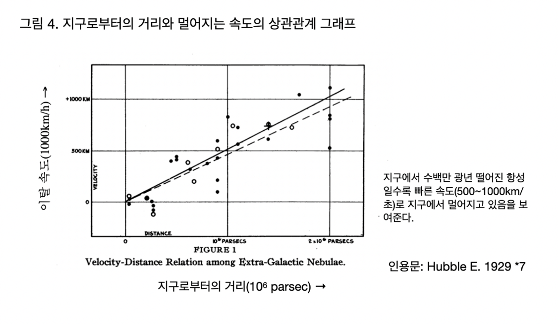 라는 당시로서는 예상치 못한 현상이 발견되었습니다. 이는 그림 4의 그래프를 보면 쉽게 알 수 있는데, 지구로부터의 거리(가로축)가 큰 별일수록 멀어지는 속도(세로축)가 크다는 것을 알 수 있습니다(*7). 이 법칙은 허블의 법칙(*8)이라고 불리는데, 아마 누구나 한 번쯤은 들어봤을 유명한 '허블 우주망원경'의 허블씨(*9)가 바로 이 법칙의 주인공입니다.