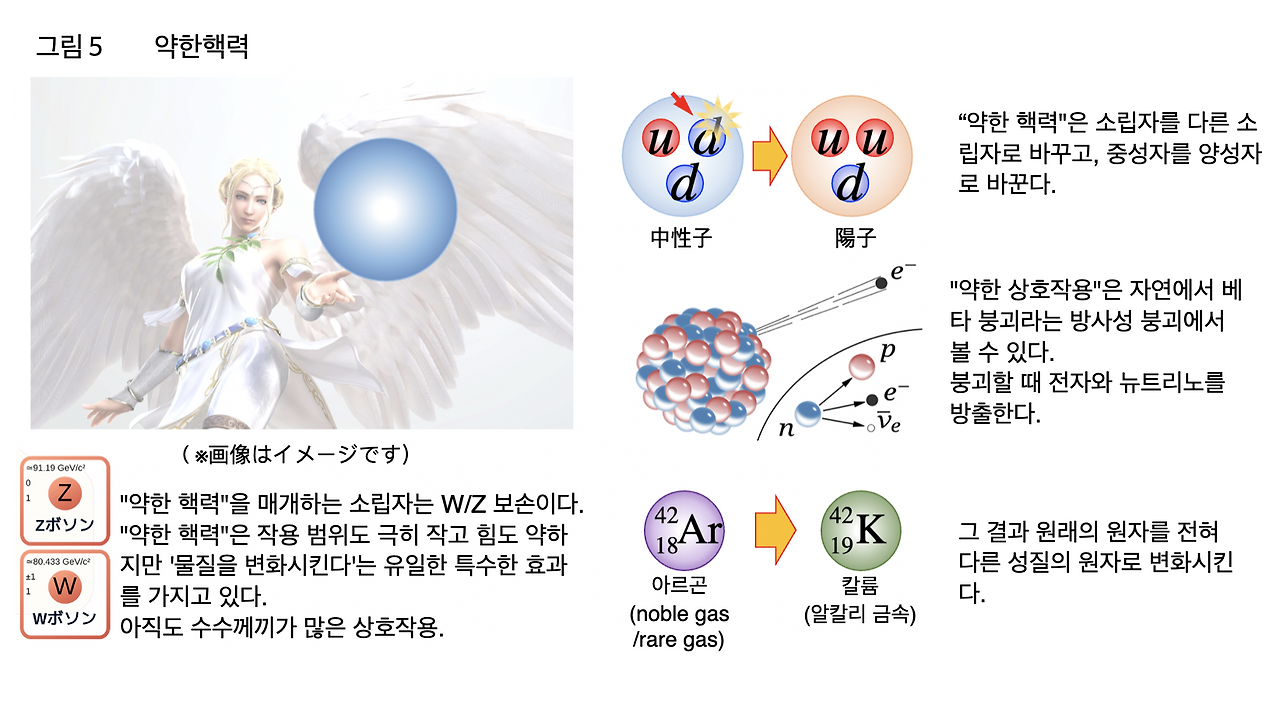 중성자가 양성자로 바뀌면 어떤 일이 일어나는가 하면, '원자의 기본 성질은 원자번호(양성자 수)에 따라 결정된다'는 법칙에 따라 '원자번호가 바뀌어 다른 성질의 원자가 된다'는 일이 일어납니다. 구체적인 예로 아르곤(Ar)은 상온에서는 안정한 기체이지만, 베타붕괴라는 약한 핵력의 작용으로 금속인 칼륨(K) 원자로 변합니다. 이외에도 '패리티 대칭성 파괴' 등 특이한 성질을 갖는 것으로 알려져 있지만, 다른 힘처럼 기본적으로 '서로 끌어당기고 밀어내는' 역학적 성질이 아니라 '물질을 변화시킨다'는 점에서 매우 독특한 존재라고 할 수 있습니다.