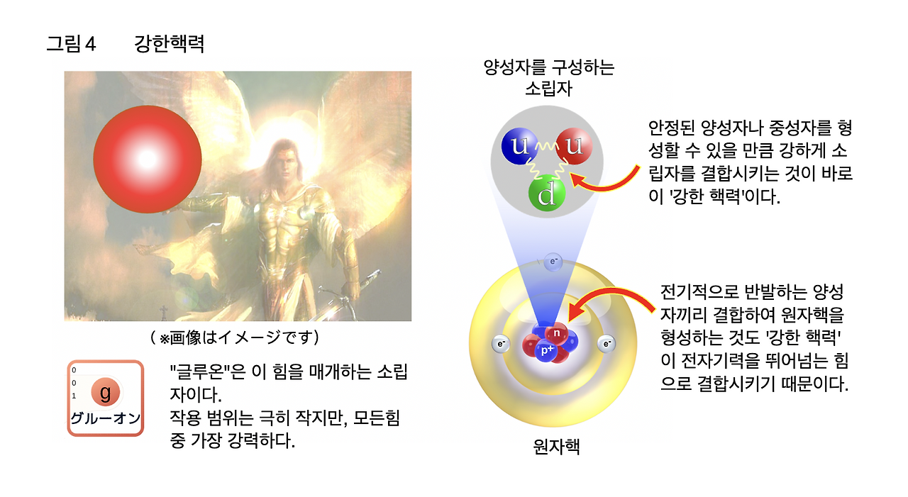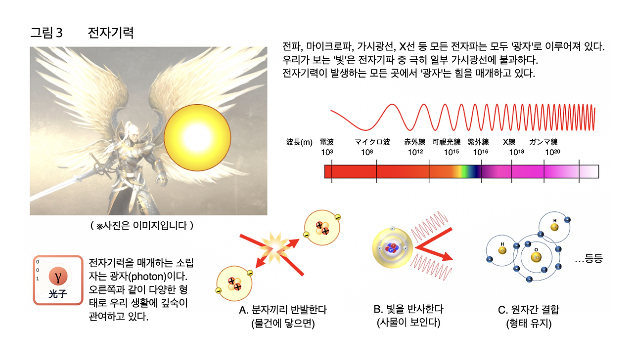 가장 먼저 누구나 들어본 적이 있고, 일상에서도 접할 기회가 많은 것이 바로 이 전자기력입니다(그림 참조, *3). 그림에는 이미지를 게재했지만, 형이상학적으로는 '힘을 관장하는 존재들', '우주의 법칙을 유지하는 존재들'이 존재한다고 생각하시면 됩니다. 기호나 문자의 나열을 싫어하는 '이공계 알레르기'인 사람에게는 이런 존재들이 더 쉽게 이해될 수 있을 것입니다.