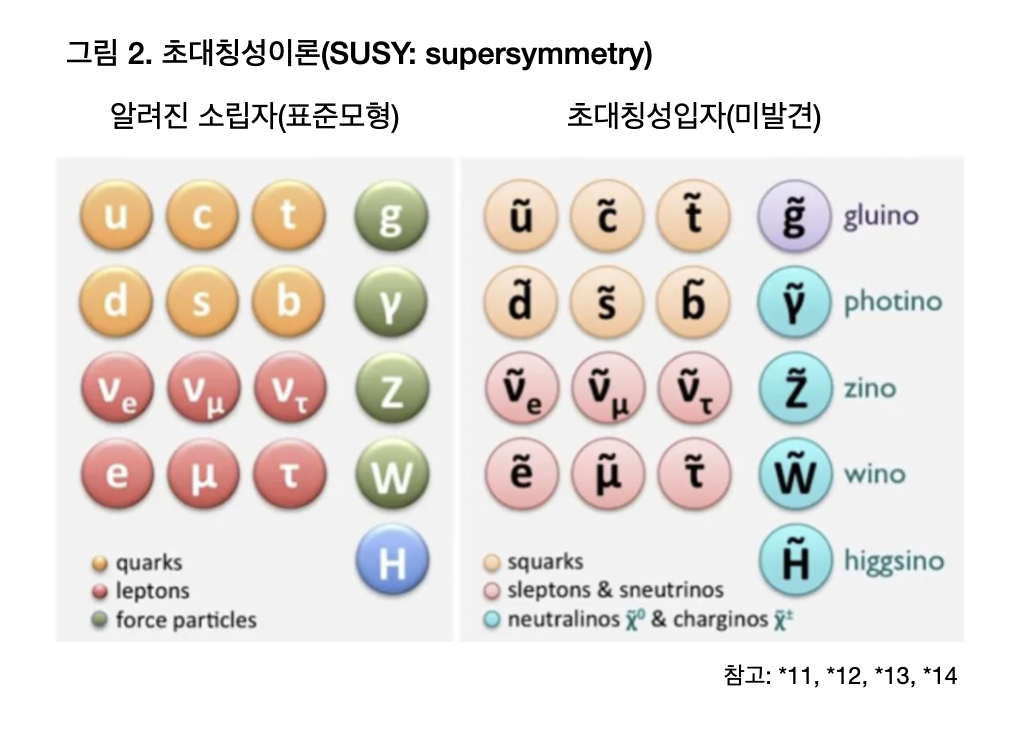 초대칭성 이론은 지금까지 알려진 소립자(그림 2 왼쪽)의 보존 입자와 페르미 입자에 각각 대응하는 페르미 입자와 보손 입자(초대칭성 입자: 그림 2 오른쪽)가 존재한다는 가설입니다.