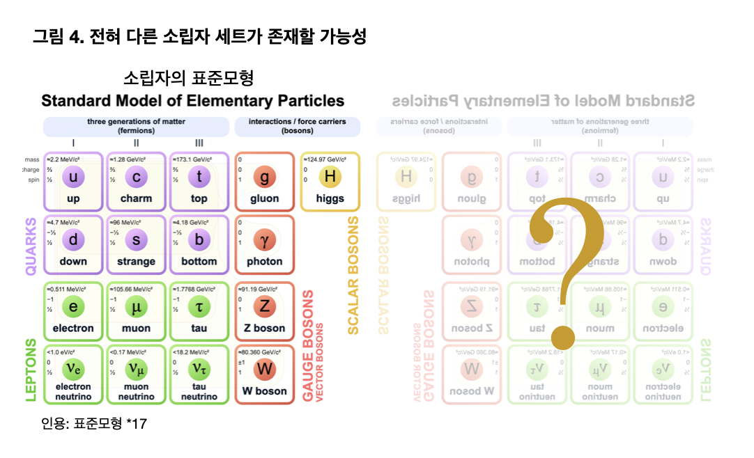우리 세계에서는 그림 4 왼쪽과 같이 양성자나 중성자를 구성하는 쿼크나 전자 같은 것들만 관찰할 수 있기 때문에(상호작용 할 수 있기 때문에), 만약 그림 4 오른쪽과 같이 중력 외에는 상호작용할 수 없는 소립자 그룹이 있다면 우리는 전혀 인지할 수 없을 것입니다. 저쪽의 소립자 세계도 우리 세계와 간섭하지 않고 별이나 은하가 만들어질 것이라고 생각됩니다.(우리 세계의 소립자와 비슷한 성질이라면).