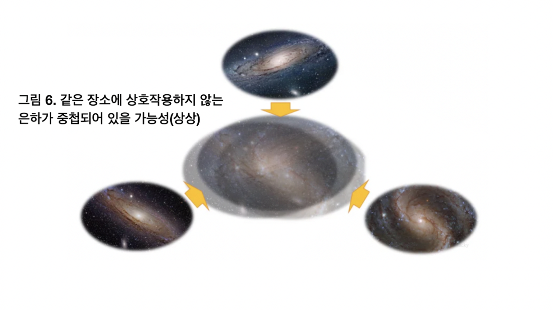 그렇다면 어쩌면 그림 6과 같이 우리가 있는 은하수가 있는 곳에는 우리은하뿐만 아니라 다른 세계의 또 다른 은하가 겹쳐져 있을지도 모르겠습니다. 게다가 한두 개가 아니라 더 많을지도 모릅니다. 오히려 그 정도여야 질량적으로 설명할 수 있을지도 모릅니다.