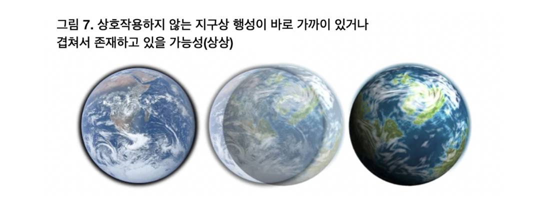 더 나아가 어쩌면 태양계와 비슷한 별계가 또 다른 소립자 세계에 있을 수도 있겠지요. 그리고 만약 "중력만 상호작용"한다면 "행성 간 중력에 의해 끌어당기면서 충돌은 하지 않기” 때문에 실제로 겹쳐서 같은 궤도를 돌고 있을지도 모르겠네요(그림 7). 패럴렐 월드와 같은 SF소설 속 세계도 "사실은 같은 좌표 공간에 존재하고 있었다"는 가능성도 부정할 수 없겠지요.