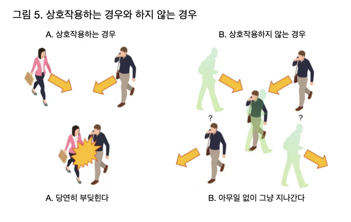 만약 "상호 작용하는 같은 소립자로 이루어진 사람끼리 가까이 다가간다면", 그림 5A와 같이 당연히 부딪히고 넘어지겠죠. 누구나 알 수 있는 당연한 일입니다. 하지만 만약 "상호작용하지 않는 소립자들로 이루어진 사람들끼리 접근하면" 어떻게 될까요? 그림 5B와 같이 "서로 아무것도 느끼지 못하고 아무렇지 않게 지나가는 것"을 생각할 수 있습니다. 물론 서로 "보이지 않고" "만질 수 없는" 상태입니다.