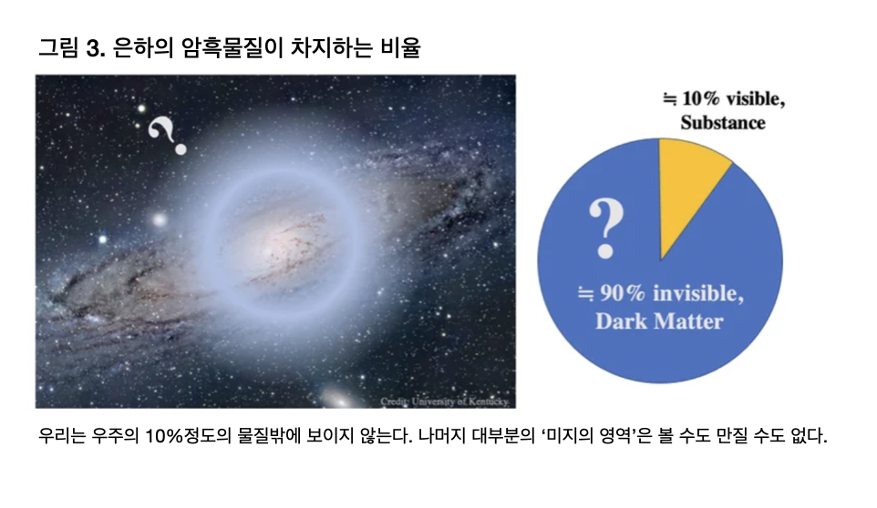 그림 3 오른쪽 그래프와 같이 이 은하나 우주에 있는 질량의 10% 정도만을 지금의 과학으로 파악할 수 있다고 말할 수 있습니다. 또한 그림 3. 왼쪽의 이미지 그림과 같이 은하에는 '무언가가 있지만', 빛/전자기파/약한 핵력/강한 핵력과 '상호작용하지 않기' 때문에 관측조차 할 수 없는 것으로 생각됩니다.