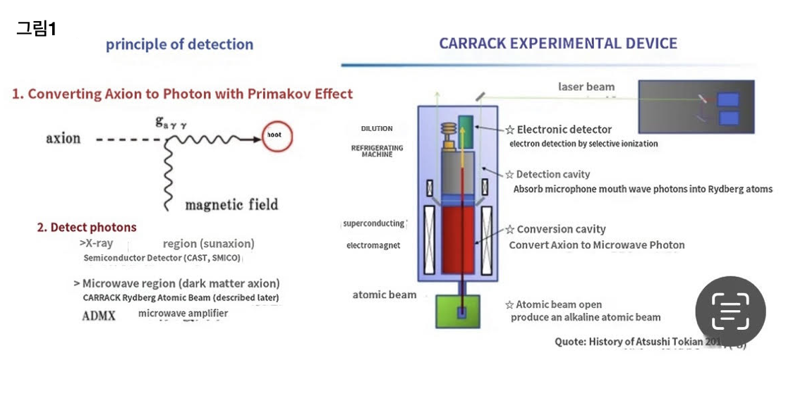 일본에서는 교토대학을 중심으로 한 프로젝트 CARRACK(Cosmic Axion Research with Rydberg Atoms in Cavities in Kyoto)라는 실험에서 발견 시도가 이루어지고 있습니다. 액시온은 '프리마코프 효과에 의해 강한 자기장 속에서 광자로 변환된다(그림 1)'고 가정하고, 이렇게 변환된 액시온을 측정하려는 시도로 보입니다.(*3, *4). 현재로서는 액시온이 발견되었다는 보고는 없지만, 앞으로의 성과가 주목되고 있습니다.