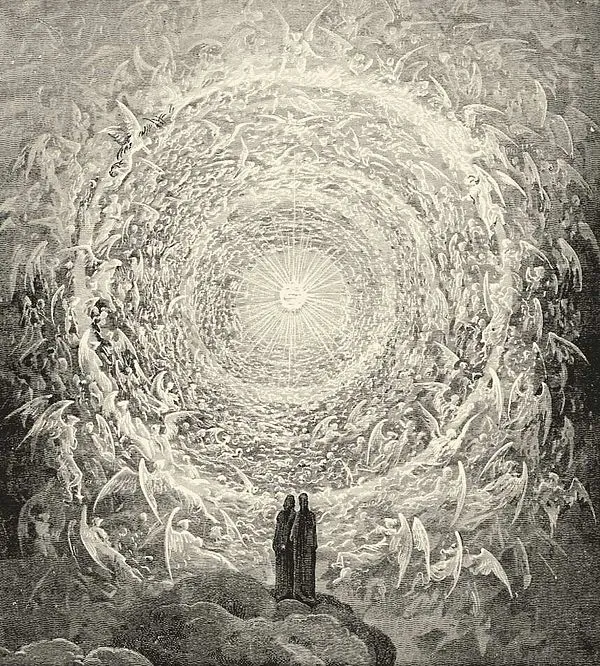 아래 그림은 14세기경 이탈리아 시인 단테가 쓴 신곡(Divina Commedia *20)의 한 장면입니다. 모르시는 분, 아직 읽지 않으신 분은 한 번 읽어보시길 추천드립니다. 그림의 장면은 천국 편에서 단테와 베아트리체가 지고천(Empyrean)에서 본 광경입니다. 보시다시피, 거기에는 무수한 천사들이 하늘에서 춤을 추고 있는 모습이 그려져 있습니다. 어쩌면 이런 세계도 정체불명의 질량의 일부로 실재하는 것인지도 모르겠습니다.