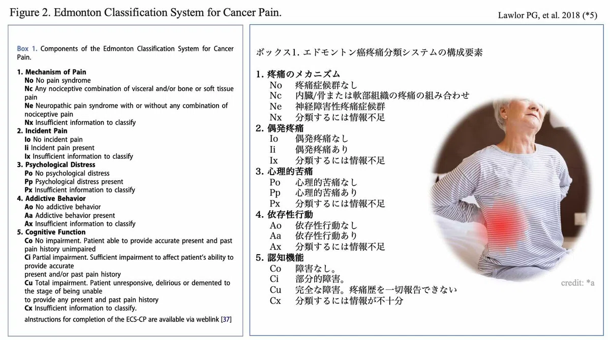 또한 "좌골신경통", "추간판탈출증에 의한 신경통"처럼 "신경의 자극에 의해 생기는 통증"이라는 것도 독특한 고통이 있습니다. 이들을 원인이나 증상에 따라 분류한 "에드몬턴 동통분류시스템(Edmonton Classification System for Cancer Pain)*4, *5"라는 것이 있습니다(Figure 2).