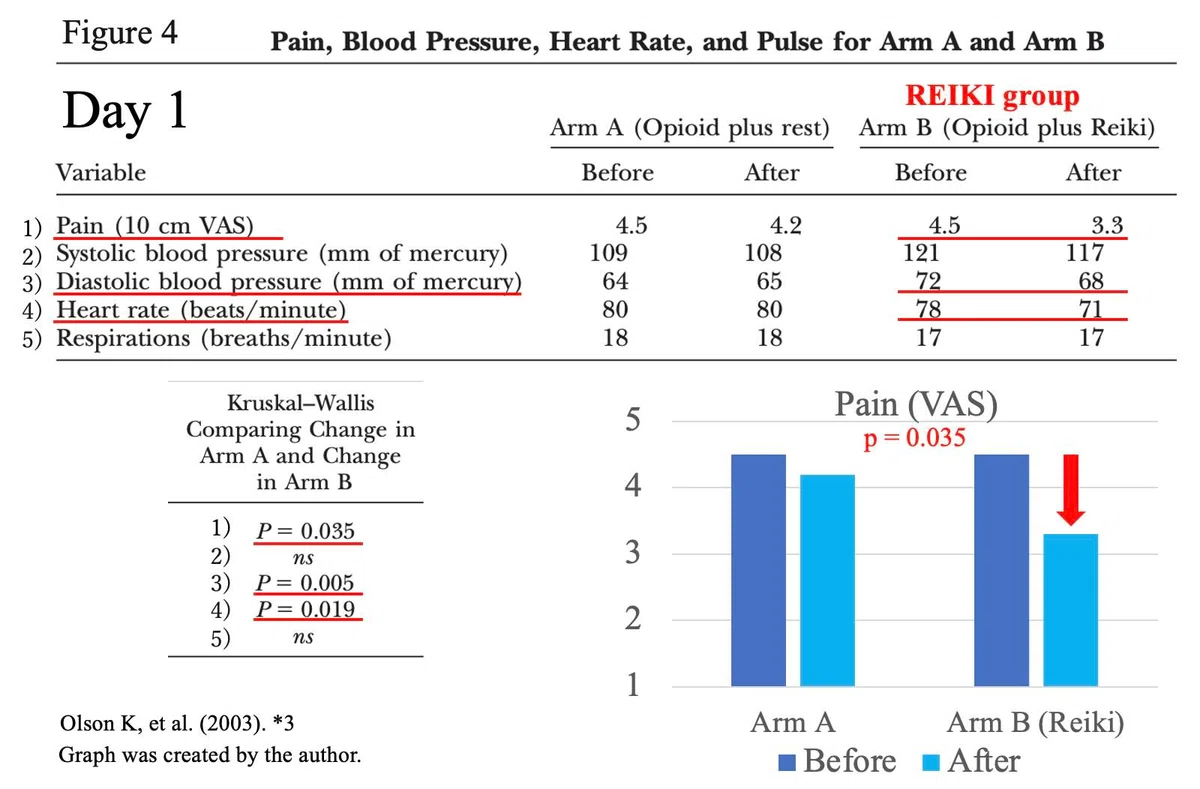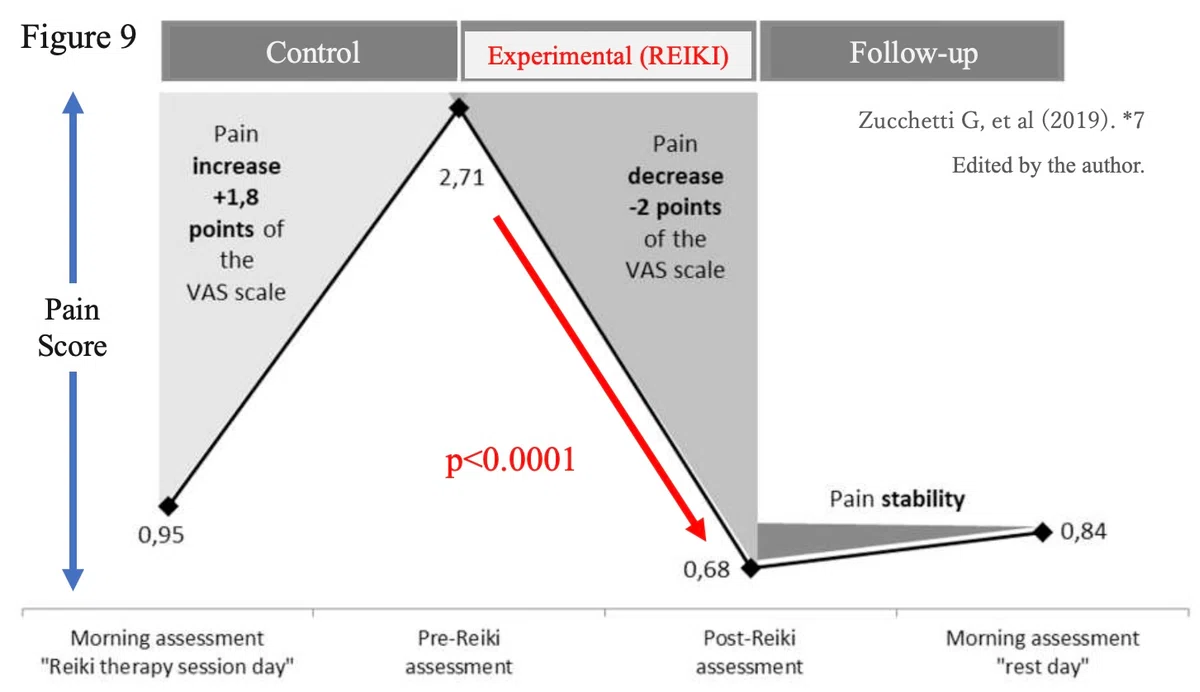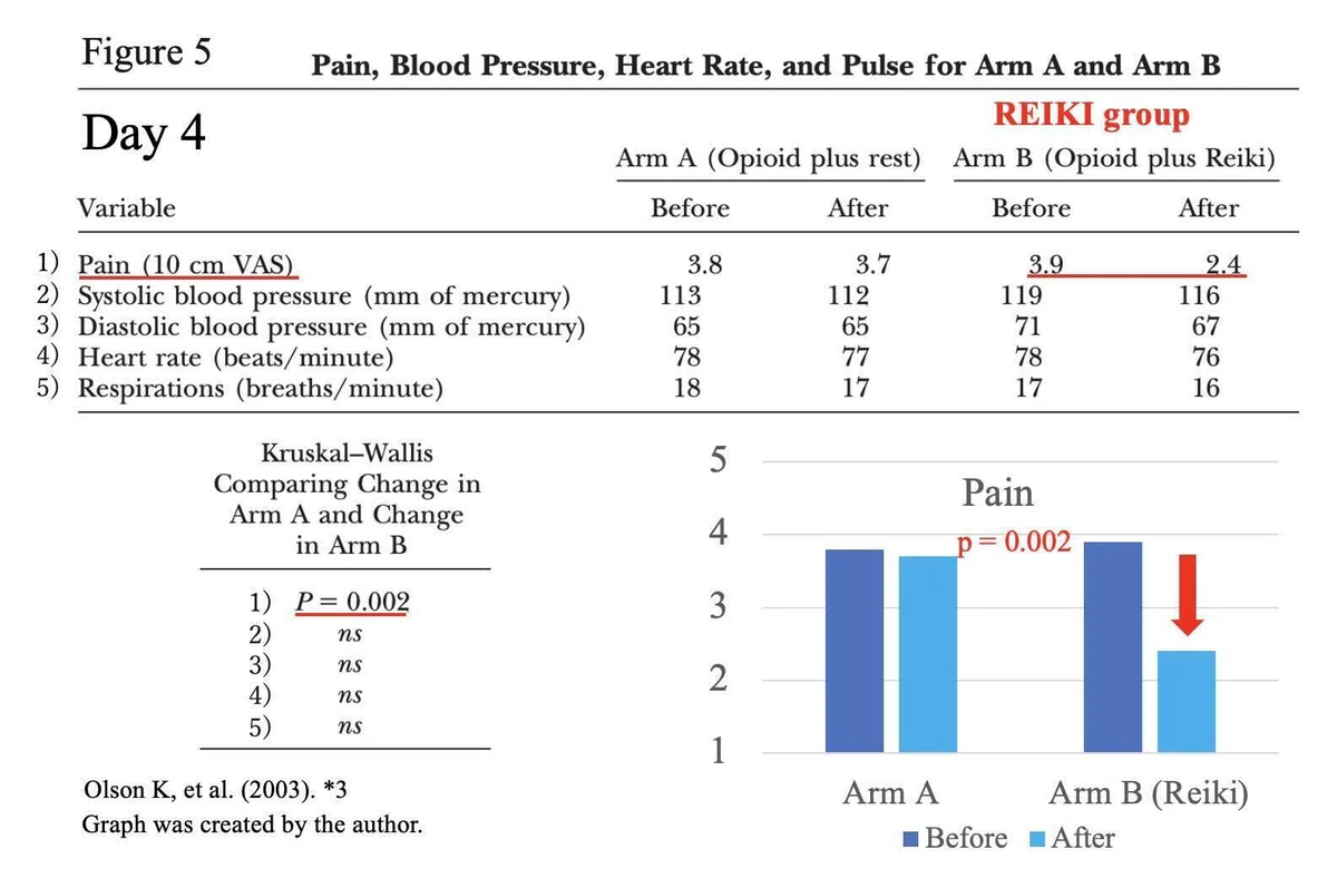 이 레이키 시술 전후의 진통효과는 통계학적 분석에서는 매우 강한 유의성(p<0.0001)을 가지고 "차이가 있다"고 결론지어졌습니다. 또한 아침의 동통 스코어에서 레이키 세션 전까지의 동통 스코어의 상승도 통계학적으로 강한 유의차(p<0.0001)가 있다고 결론지어졌습니다.