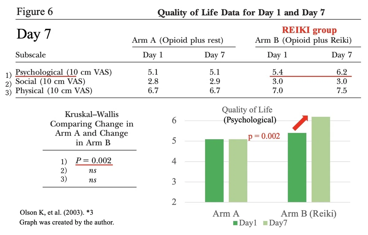 여기까지를 정리하면, 레이키요법은 "적은 횟수라도 통증에 대해 유의한 진통효과가 있다"고 할 수 있습니다. 그리고 "유의하게 심리적 쾌적함(QOL)을 개선시킨다"는 2차적 효과도 기대할 수 있는 것 같습니다.