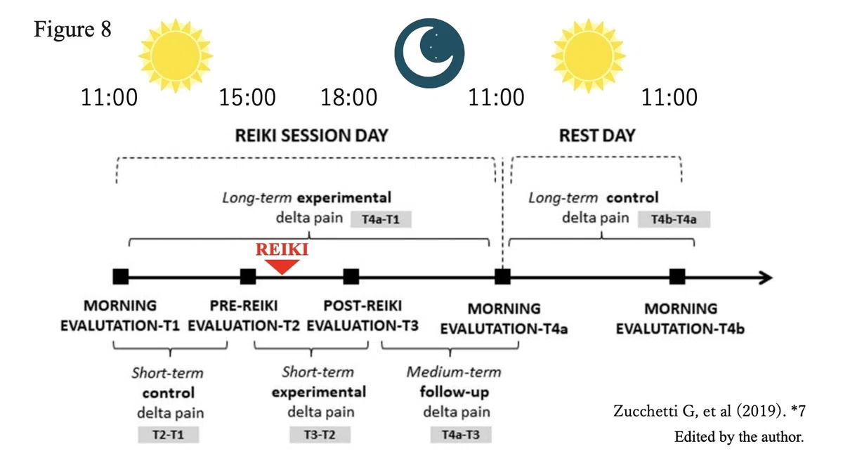 레이키의 스케줄은 1회 30분, 주 3일(격일로 실시) 실시되어 1개월간 계속되었습니다. 통증의 평가는 Figure 8에 나타난 바와 같이 오전 11시에 최초의 통증 평가, 15시에 레이키 세션 전의 통증 평가, 18시에 레이키 세션 후의 통증 평가, 다음날 11시에 또 통증 평가라는 사이클로 평가되었습니다.