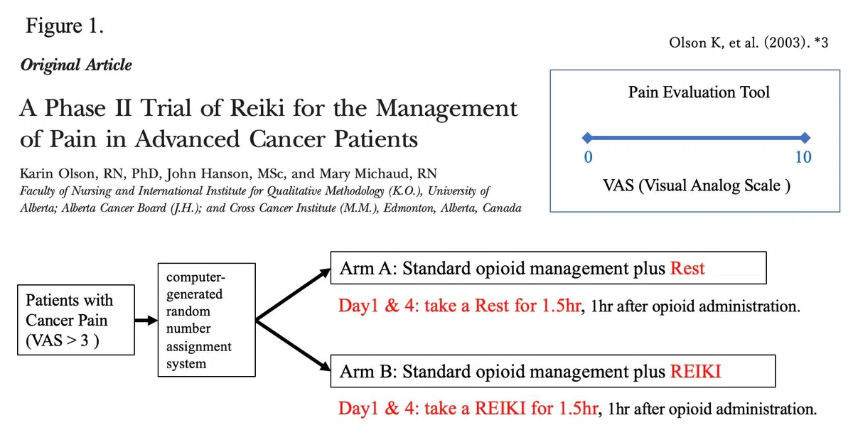 이번에 소개하는 연구는 "A Phase II Trial of Reiki for the Management of Pain in Advanced Cancer Patients (진행암환자의 동통관리를 위한 레이키의 제2상 임상시험)*3"라는 제목으로 2003년에 캐나다의 알버타대학병원(University of Alberta)에서 발표된 것입니다.