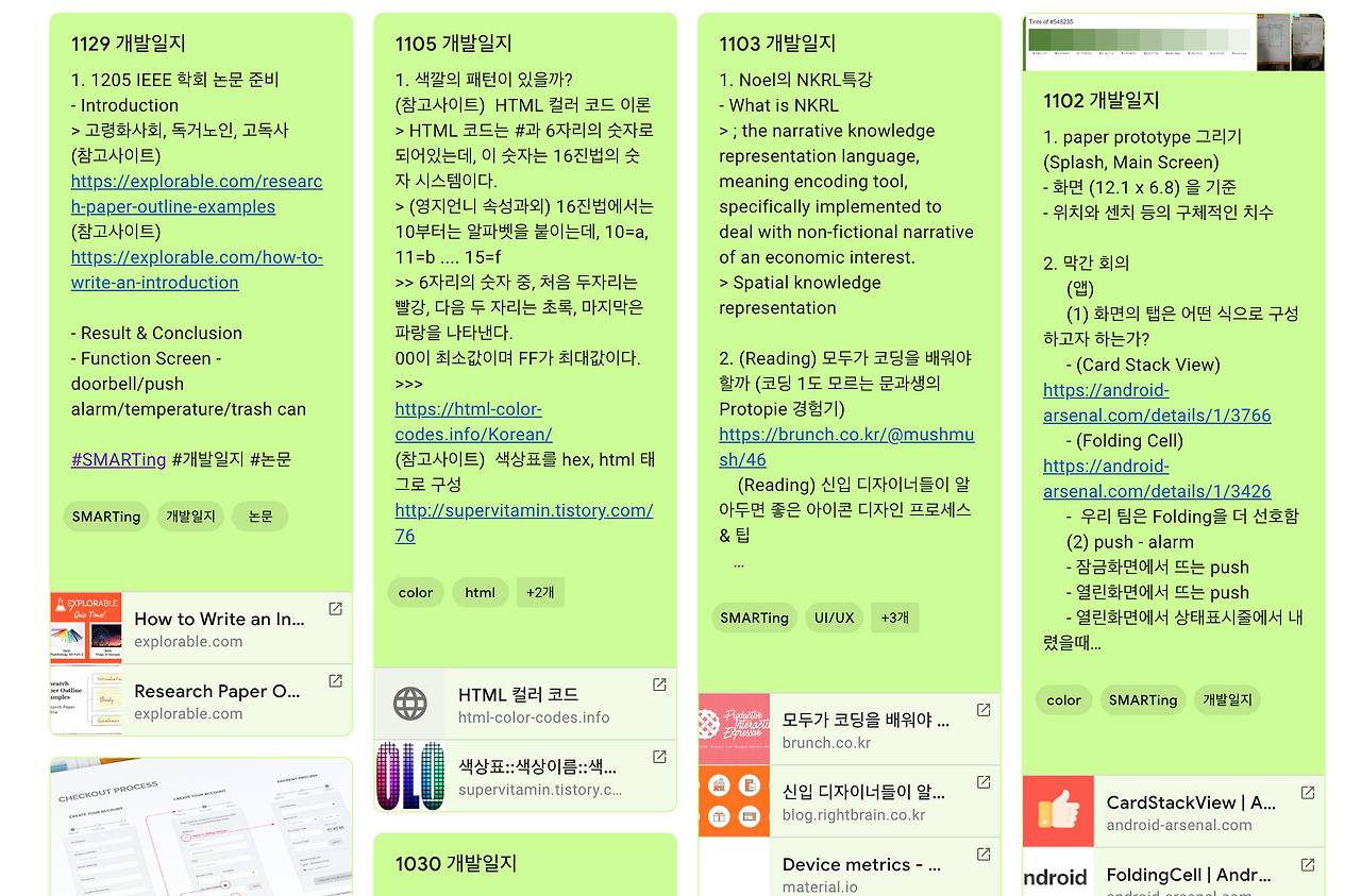 내게 남은 것은 크게 2개가 더 있는데, 그중 하나가 개발일지이다. 팀장 오빠가 매일같이 배운 것, 문제를 해결한 것, 참고한 것 등 일지를 쓰면 좋다고 하면서 googlekeep를 추천해줬는데, 처음 쓸 때는 귀찮다가 점점 쌓여가니 기록 창고가 되어 뿌듯한 일지들이었다. 이번 브런치를 쓰면서 참고를 많이 했더랬다.