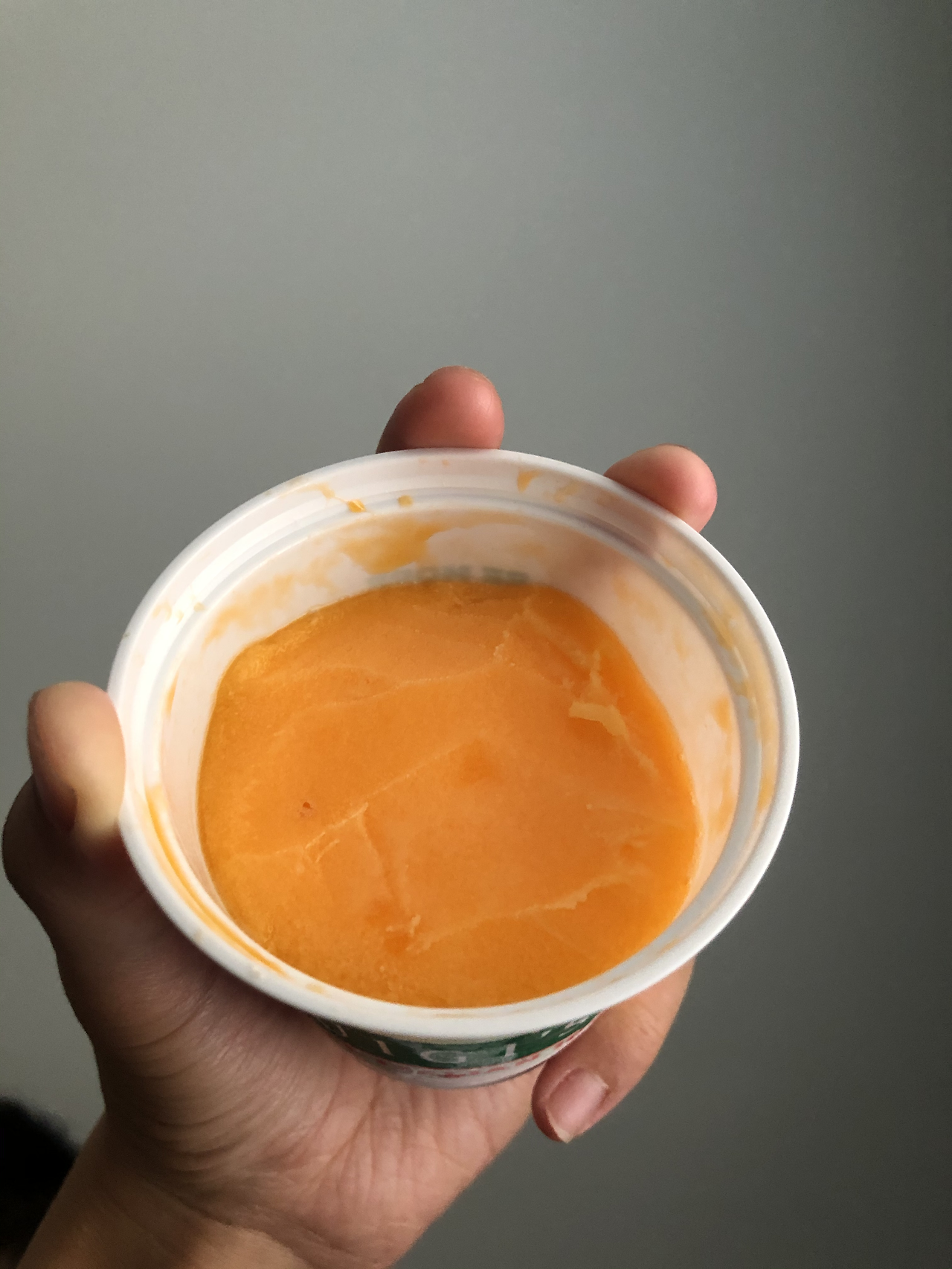 이건 망고맛인데 원래 오렌지맛이 진짜 맛있다. 사실 이 맛 말고도 많다. 친구 말로는 그냥 떠먹는 거보다 숟가락으로 앞뒤로 샤샤샤샥 긁어서 먹으면 훨씬 부드러운 맛이 난다고 한다.