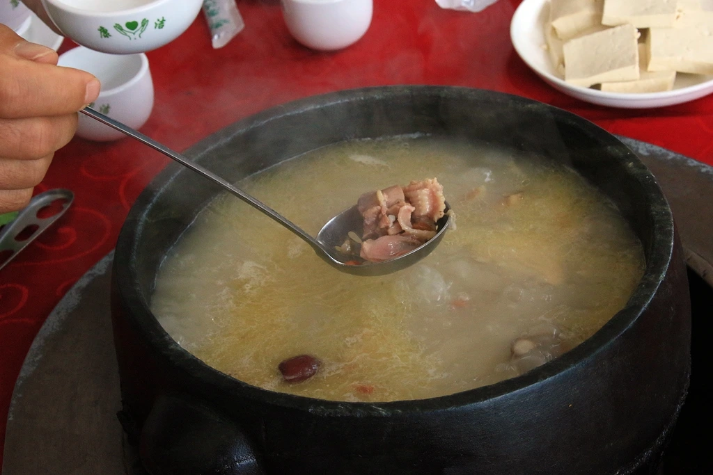 루랑에 오면 먹어보지 않으면 안 되는 요리가 있다. 석과계(石锅鸡)다. 농민들이 영계에 삼과 천마 등 약재를 넣고 푹 고아 먹던 음식이다. 1999년 루랑에서 27년을 생활한 충칭 사람, 허다이윈(何代云)이 상품화했다. 충징에서 개업했는데 반응이 폭발적이었다. 루랑 사람들이 즐겨 먹던 그대로의 맛으로 큰 주목을 받았다. ‘정통’ 입맛을 무기로 루랑 마을도 덩달아 유명해졌다. 닭고기를 먼저 먹고 국물에 야채와 버섯 등을 넣어 샤부샤부처럼 먹는데 꿀맛이다. 역시 닭은 담백한 국물 맛을 내기 좋은 재료다.