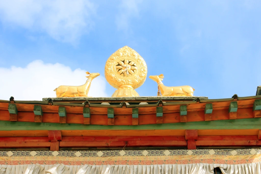 5층 높이 대전 지붕은 화려한 장식으로 눈부시다. 비첨에는 맹수가 노려보고 있고 원통의 마니룬(玛尼轮)은 하늘을 향하고 있다. 법륜 옆 사슴까지 햇살의 울림이 상당하다. 모두 도금으로 장식한 까닭이다. 티베트 사원 지붕에 법륜과 함께 등장하는 사슴 두 마리는 석가모니의 최초 설법지인 녹야원을 상징한다. 수레바퀴처럼 부처님 말씀이 널리 온 사방에 퍼져나갈 듯 송찬림 지붕은 유난히 금빛 찬란하다.