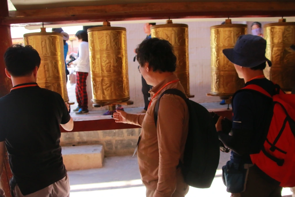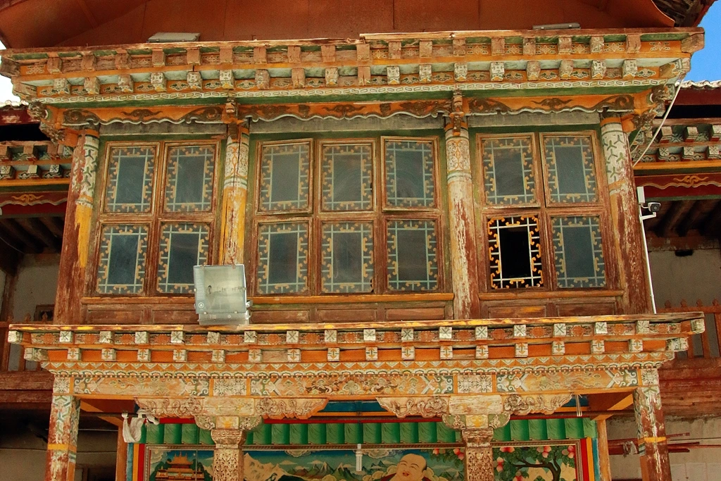 수쑹촌(书松村) 마을답게 아담한 사원답게 입구도 투박한 나무문이다. 안으로 들어서니 마니룬(玛尼轮)도 5개뿐이다. 빙글빙글 돌리고 들어선 마당에 서니 4층 높이의 목조건물이자 본전인 대경당(大经堂)이 자리 잡고 있다. 백토의 벽 창문의 가림 천 문양은 봉건시대 정전제 봉토처럼 아홉 등분된 모양이 이채롭다. 실내는 송경처(诵经处)인데 양팔로 껴안아야 할 만큼 커다란 나무기둥이 82개가 조밀하게 박혀 있다.