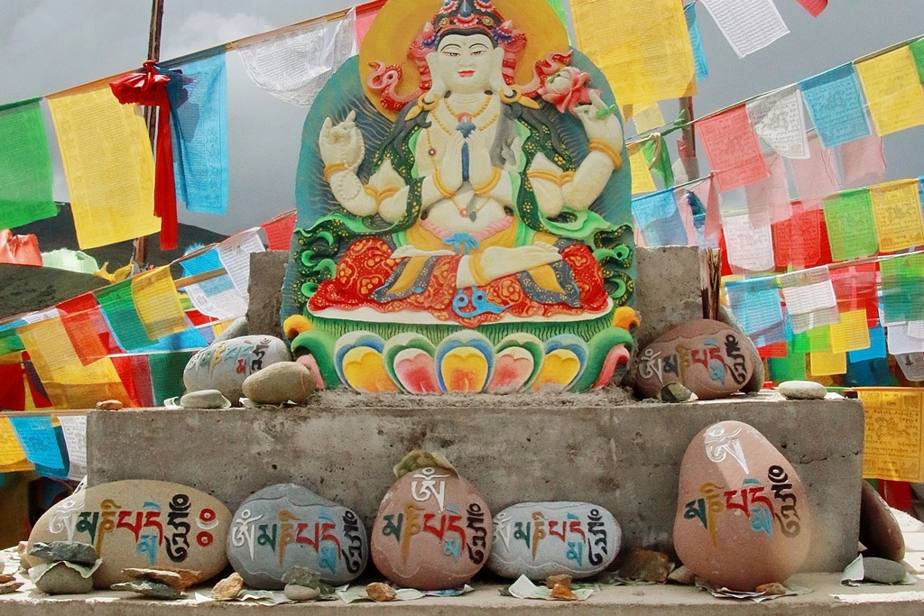 바이마 설산(白马雪山)을 관망하면서 차가 달린다. 해발 4,292m 지점에 이른다. 음료와 과자를 파는 가게 창문에 걸터앉은 소녀는 사람들에게 관심도 없다. 사면 사고 말면 말라는 식이다. 불경을 새긴 오색 천이 만국기처럼 긴 줄에 나부낀다. 이를 타르쵸라 부르는데 불심이 널리 초원에 퍼져나가길 염원하는 것이다. 티베트 문자로 ‘옴마니팟메훔’을 색색이 새긴 마니석도 놓여 있다. 이 고개가 샹그릴라와 옌징이 있는 더친(德钦)의 경계다. 어느덧 오늘 일정의 반을 달려왔다.