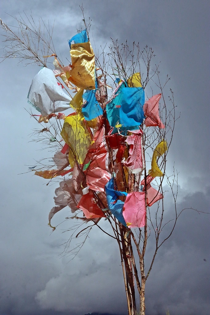 하늘 향해 사진을 찍으니 연회색의 구름이 보색의 효과를 드러내듯 더욱 선명하다. 이 화사하게 번지는 보색 대비의 룽다에 어찌 반하지 않을 것인가? 독수리처럼 하늘을 향하지만 사실은 차마고도를 따라 달리고 싶은지도 모르겠다. 티베트의 역사는 바람처럼 변한 적이 없는 룽다처럼 초원 위에 그대로 머물고 있는 것이니 말이다.