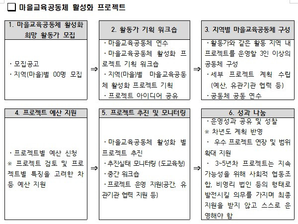 좀 더 마을교육공동체를 활성화시킬 수 있는 새로운 방안에 대한 아이디어가 필요한 상황이다. 먼저 1년짜리 공모사업의 형태로만 진행되는 것은 지양되어야 할 것이다. 어떻게 1년 안에 생태계가 완성될 수 있겠는가? 마을교육공동체를 기반으로 학습을 위한 배움터가 태동하고 다양한 갈등과 모순을 이겨내며 성장하고 스스로 지속가능성을 가지기까지 흐름을 보장해 주어야 한다.