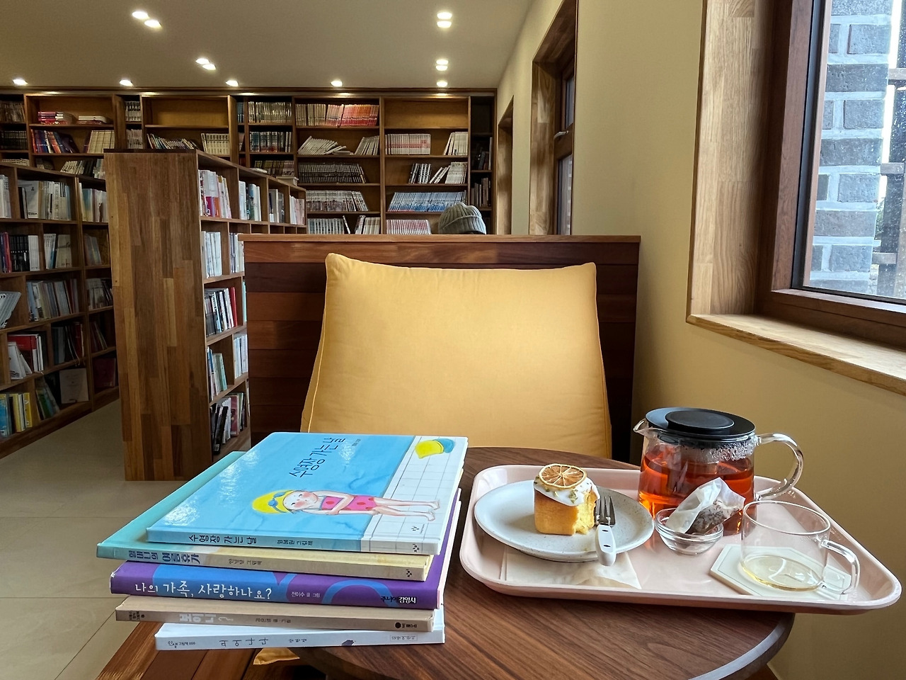 <유람위드북스>에는 판매용 새 책보다는 차를 마시며 읽을 수 있는 책들이 훨씬 많았다. 읽고 싶은 책을 욕심껏 한 무더기 가져와 파란 하늘과 돌담이 보이는 커다란 창가 옆 좌식 테이블에 자리를 잡고 앉았다. 주문한 새콤달콤한 레몬 케이크에 홍차를 마시며 책을 읽다가 문득문득 고개를 들어 창밖을 바라보는 그 시간이 어찌나 행복하던지. 돌아갈 버스 시간이 다가오는 게 안타까울 정도였다. 나갈 때 보니 앉을 자리가 나기를 기다리는 이들이 여럿 있었다. 비록 뚜벅이가 가기에 교통이 편하지도, 또 가서 대기까지 하며 기다려야 할 수도 있는 책방이지만, 누가 가도 책과 함께 편안하고 행복한 유람을 할 수 있는 곳인 건 분명해 보였다.