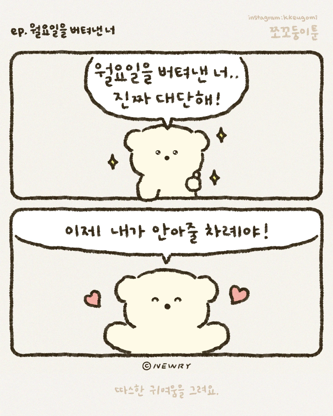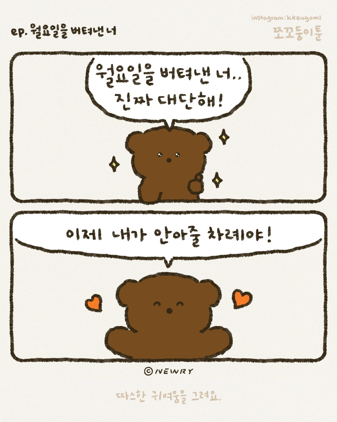 이모티콘 작가, 일러스트레이터. 따스한 귀여움을 그려요. 끄곰이와 아기끄곰의 마음 포근한 이야기, 엉뚱하고 귀여운 쪼꼬둥이들과, 우리의 하루를 닮은 눈토의 소소한 이야기도 함께.