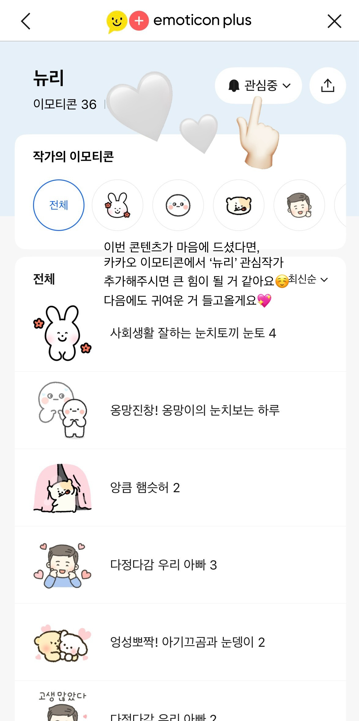 이번 콘텐츠가 마음에 드셨다면, 카카오 이모티콘에서 ‘뉴리’ 관심 작가로 추가해주시면 큰 힘이 될 것 같아요! 다음에도 귀엽고 따뜻한 이야기로 찾아뵐게요.