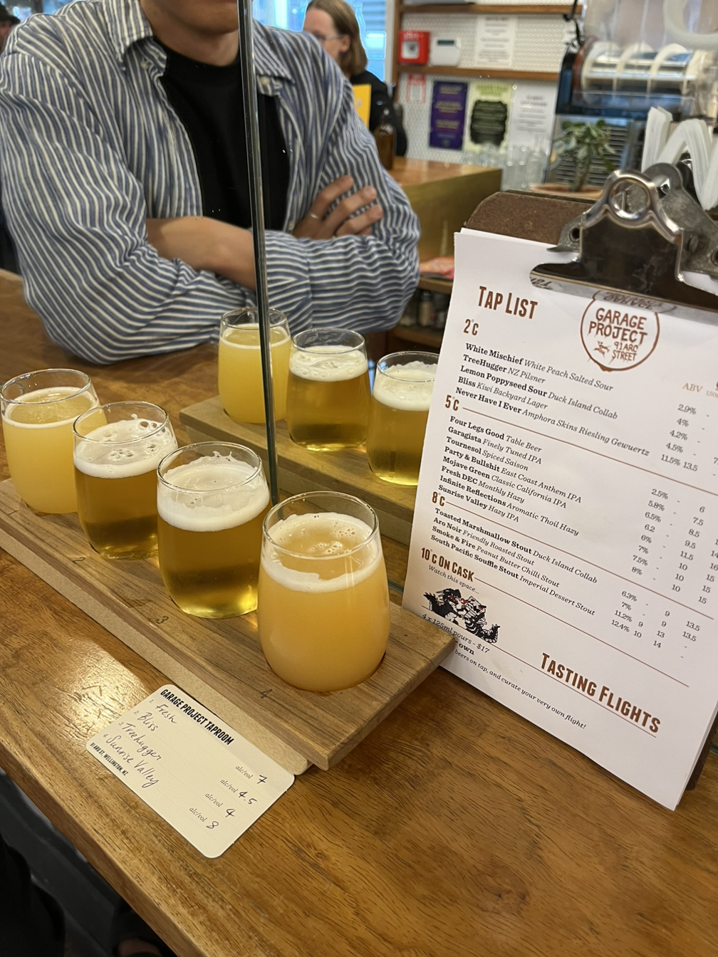 호텔로 돌아가 한숨 자고 헬스장에서 간단히 운동하고, 연휴에도 문을 여는 맥주 브루어리를 가기로 했다. “Garage Project”는 오클랜드 Kingsland에도 매장이 있는 곳이지만 웰링턴에서 가보기로 했다. 한국의 스몰비어 가게처럼 안주는 간단했고 대신 열 종류가 넘는 맥주 탭이 매달려 있다. 우선 샘플러로 네 종류를 맛보고 각자 원하는 걸로 시켜서 마셨다. 요즘 내 취향은 Hazy IPA다. 우중충한 도시로 남았던 웰링턴의 기억이 청량감으로 덮이길.