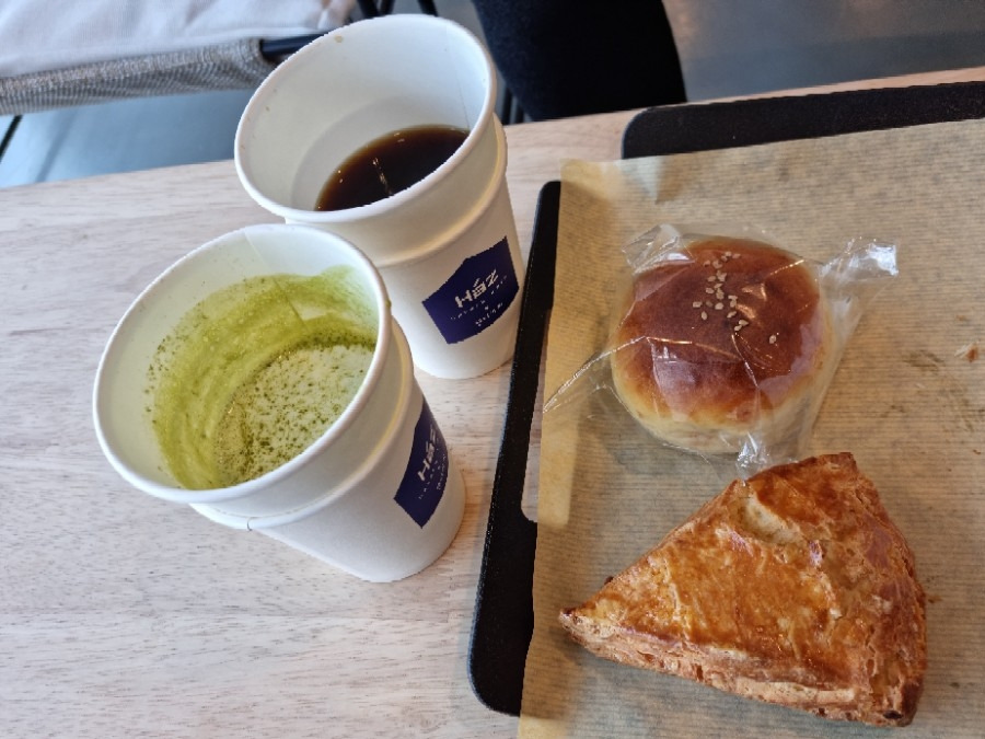 1층에는 베이커리가 있다, 많은 종류의 빵이 있는데 가격이 꽤 비쌌다. 예전에 나였다면 주저 없이 나갔을 거다. 하지만 큰 건물과 분위기 있는 인테리어 그리고 도심에 이런 곳이 있다는 것에 가격을 받아들였다. 나는 팥이 듬뿍 들어간 만주 빵을, 아내는 좋아하는 스콘 그리고 샌드위치를 골랐다. 음료는 아메리카노와 녹차라테를 시켰는데 점원이 커피는 드립 커피라 했다.