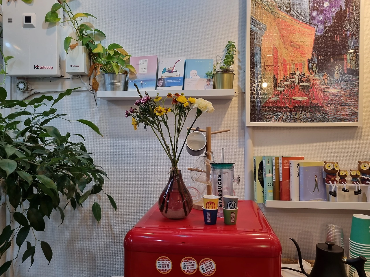 누군가 다정히 내 이름을 부른다면 내 마음이 어떨까? 어릴 적에는 마당에서 놀고 있으면 어머니가 "시원아 밥 먹어"라는 소리가 그러했는데.. 그때 생각하니 울컥했다. 다행이다 아직 7시라 매장에 올 손님이 없으니.... 성인이 되고 보니 옛날의 그 시절이 그립고 참 많은 것을 포기하며 사는구나라는 생각을 한다. 비 오는 오늘 같은 날 누군가 내 이름을 다정히 부르길 바라며 빨간 냉장고 위에 올려놓은 화병에 꽃들에게 다정히 말했다. "오늘도 고마워"
