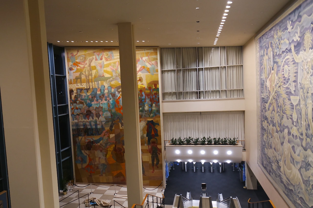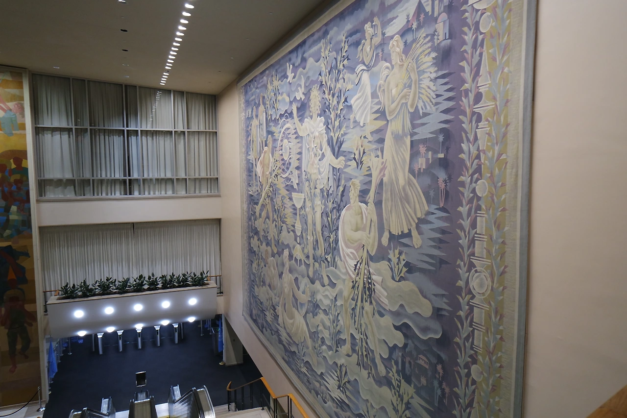 그리고 마지막으로 그 유명한 유엔 총회실. 총 200석이고 1년에 한번 제비뽑기를 해서 첫번째 자리에 앉을 국가를 정하고 그 뒤로는 국가명 알파벳 순으로 앉는다고 한다. 벽 디자인이 뭔가 모든 국가를 하나로 감싸려고 하는 모습 같다.