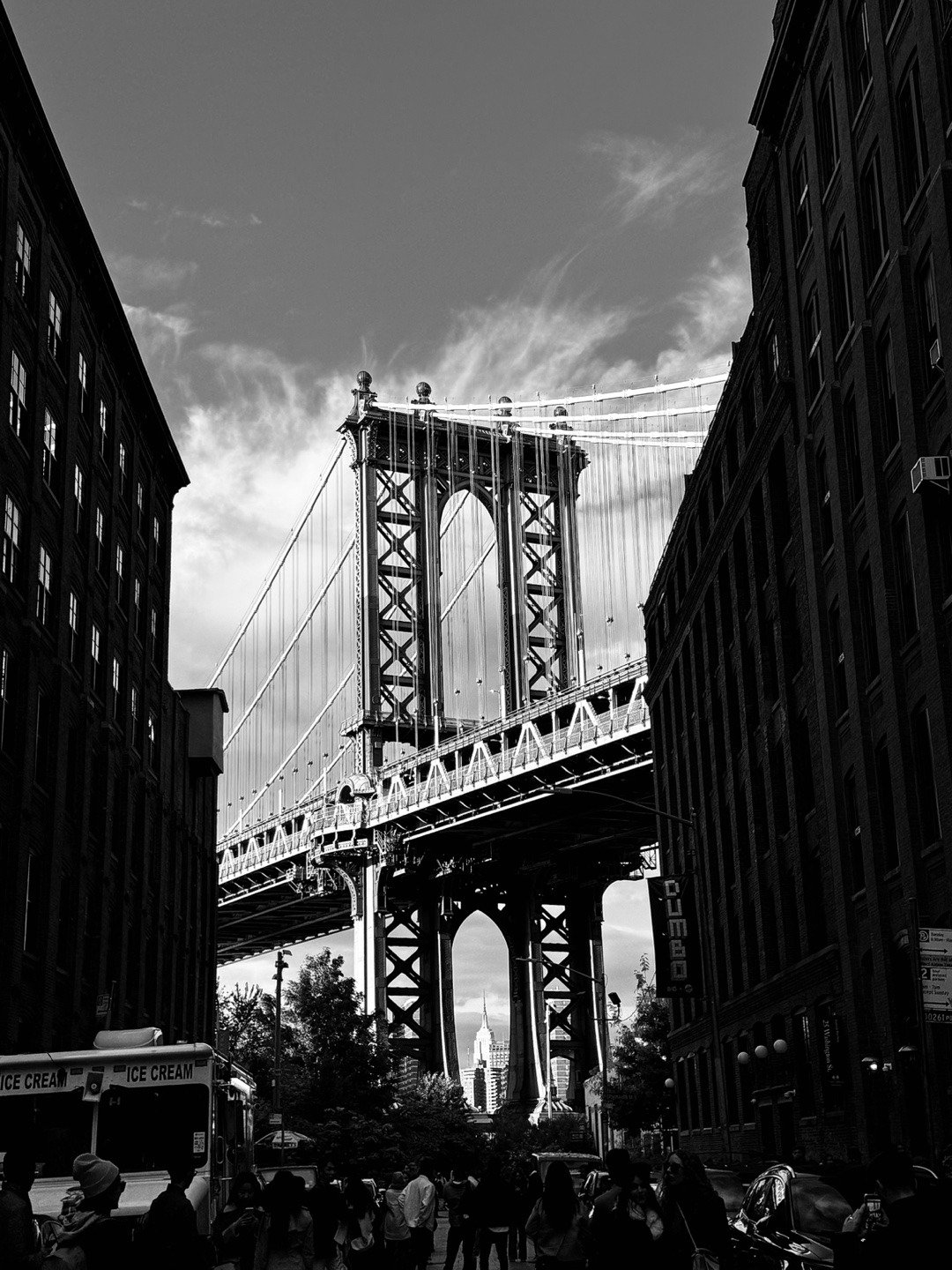 프런트 스트리트 (Front Street)에 가면 덤보의 붉은 벽돌 건물 사이에 위치한 유명한 사진 스폿을 찾을 수 있다. 영화 포스터의 장면으로 제작된 후 더욱 유명해진 이곳은 벽돌을 사이에 덤보가 한가운데에 나오게 하여 많은 관광객들이 사진을 찍는다. 웨딩 사진 촬영지로도 유명해 가면 심심찮게 웨딩 촬영을 하는 모습을 볼 수 있다. 아침 일찍 가면 비교적 한산하기 때문에 사진에 진심이라면 일찍 덤보에 방문하길 추천한다. 이곳은 차량이 다니는 도로기 때문에 사진을 찍을 때 조심하도록!