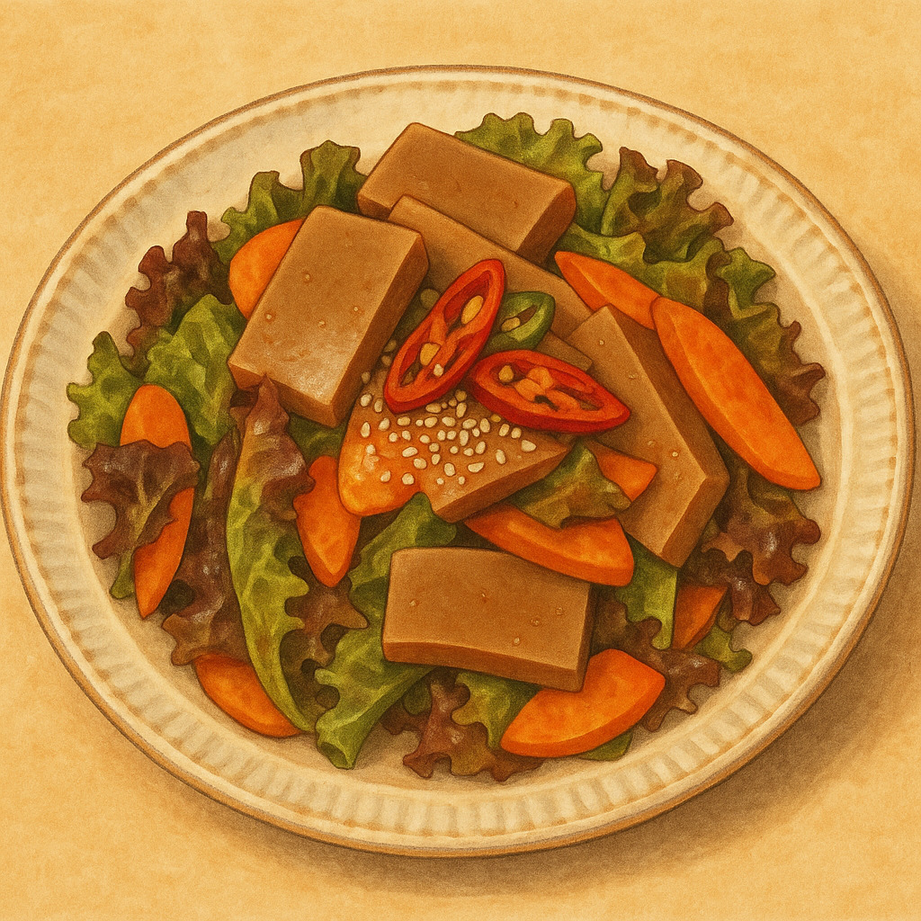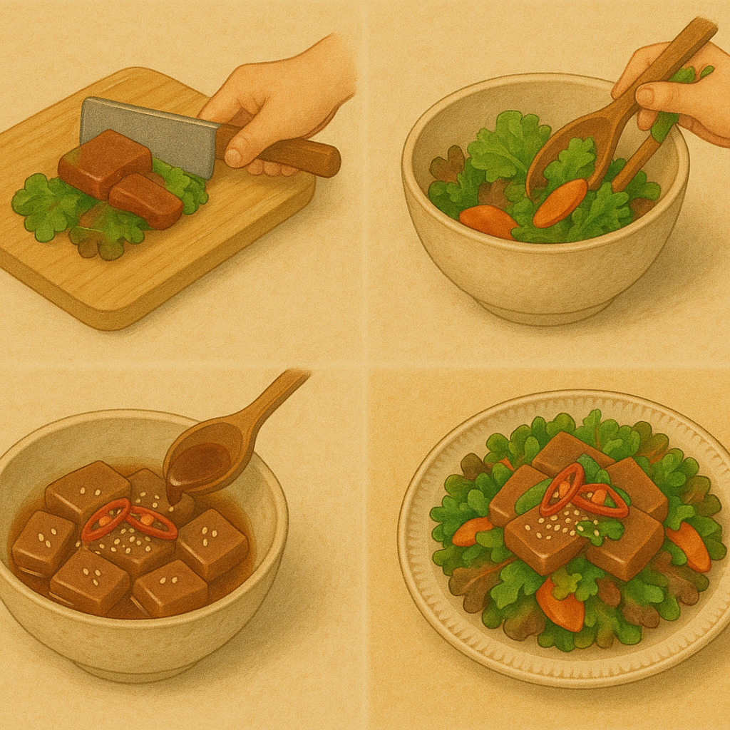 마트에서 고른 상추는 물처럼 싱그럽고, 오이와 당근은 아삭한 식감을 더해준다. 이 작은 재료들이 모여 한 끼 식사가 되며, 더 맛있고 건강한 느낌이 든다. 상추, 오이, 당근 등 야채는 각기 다른 맛과 식감을 가지고 있지만, 도토리묵의 부드럽고 고소한 맛을 돋보이게 해 주며 이 모든 재료가 한 접시에 담길 때, 마치 작은 소풍처럼 기분 좋은 느낌을 준다.
