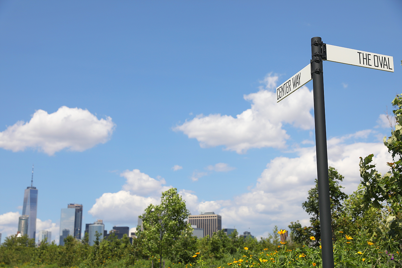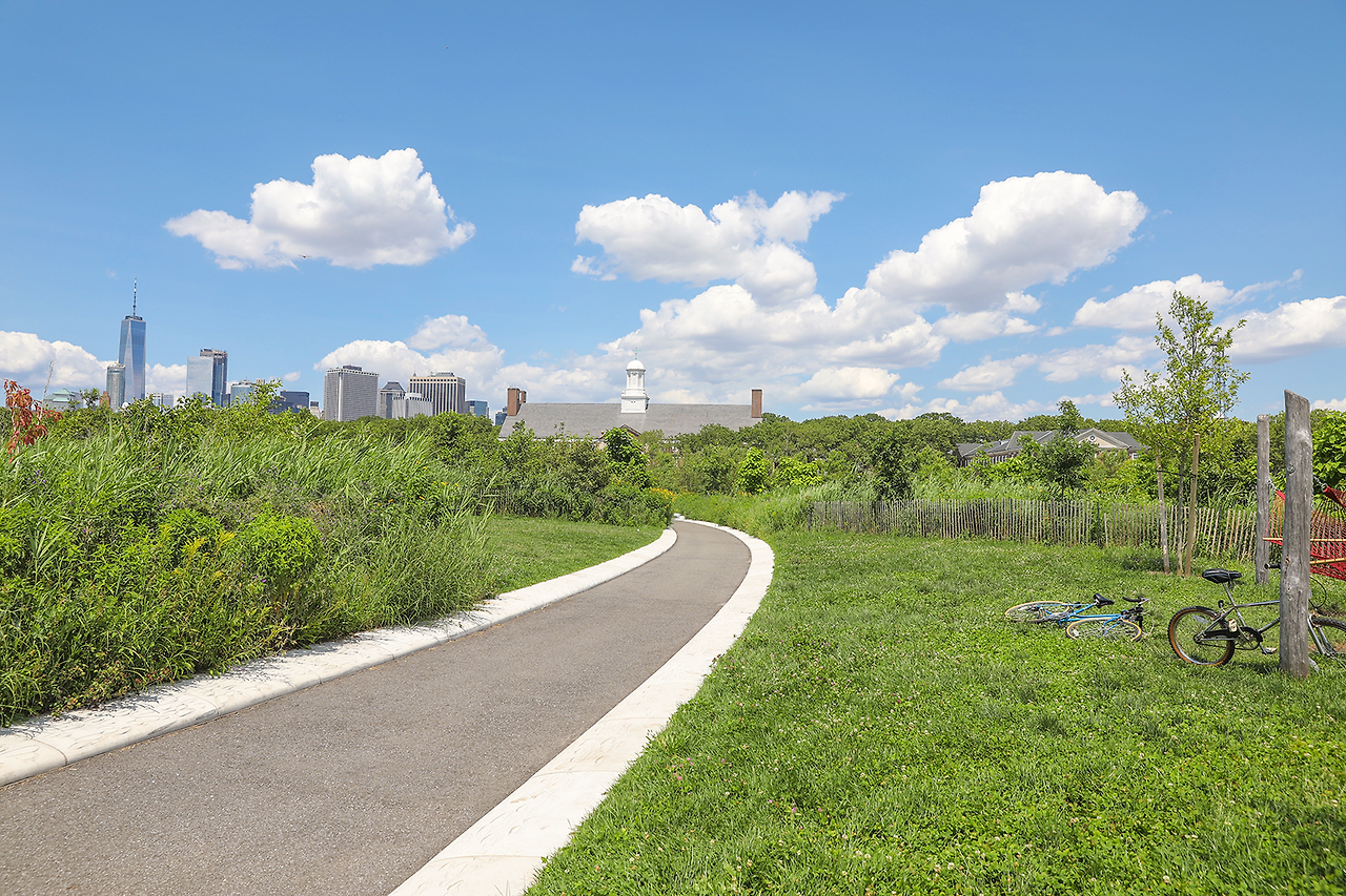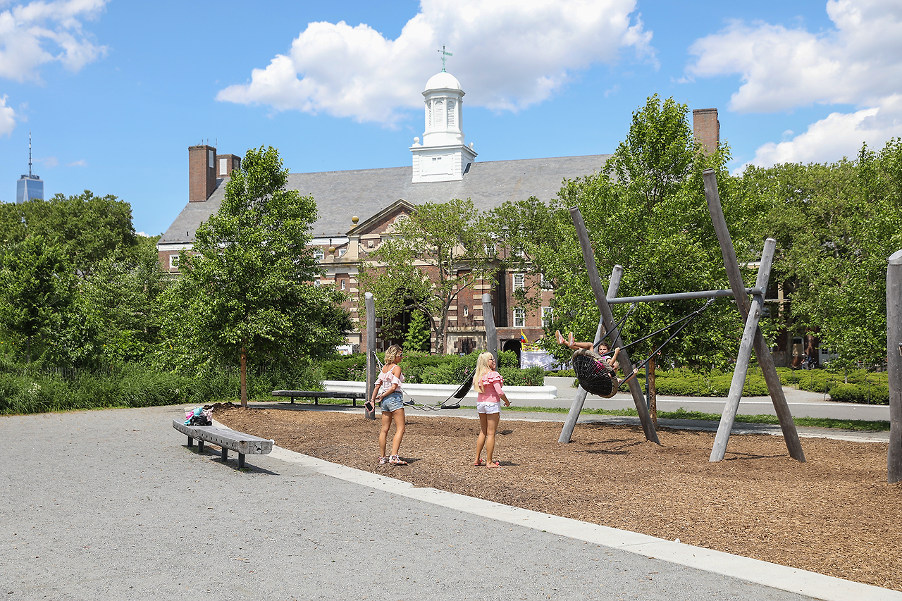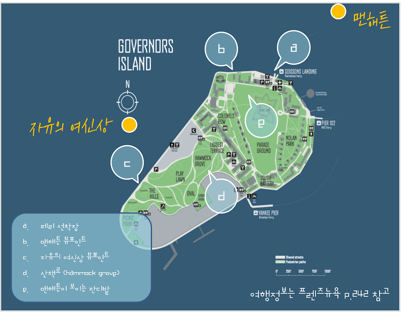 (a)페리에서 내려 (b) 로어맨해튼이 손에 잡힐 듯 가깝게 보이는 산책로를 따라 (c) 자유의여신상 뷰포인트를 방문한 뒤, 언덕(The Hillls)에 올라 맨해튼 스카이라인을 감상한다.(d) 중심부의 산책로에는 해먹과 놀이터 등 다양한 쉼터가 조성되어 있다. (e) Parade Ground로 이어지는 구역에는 옛 막사 건물들이 남아 있다.
