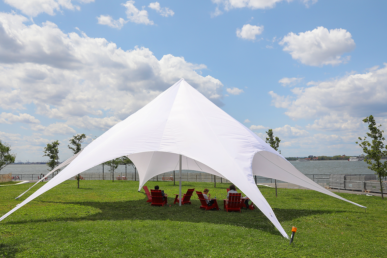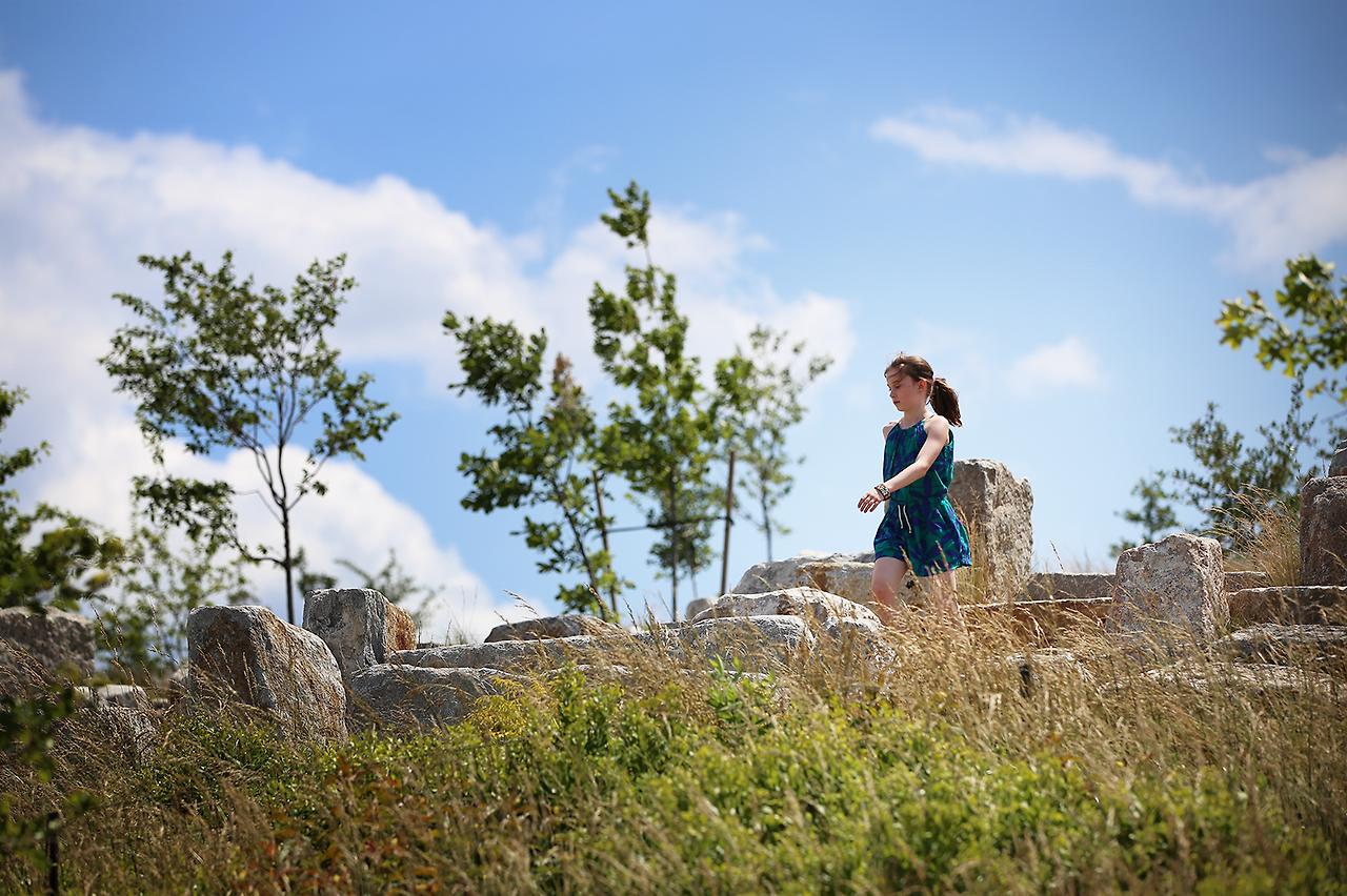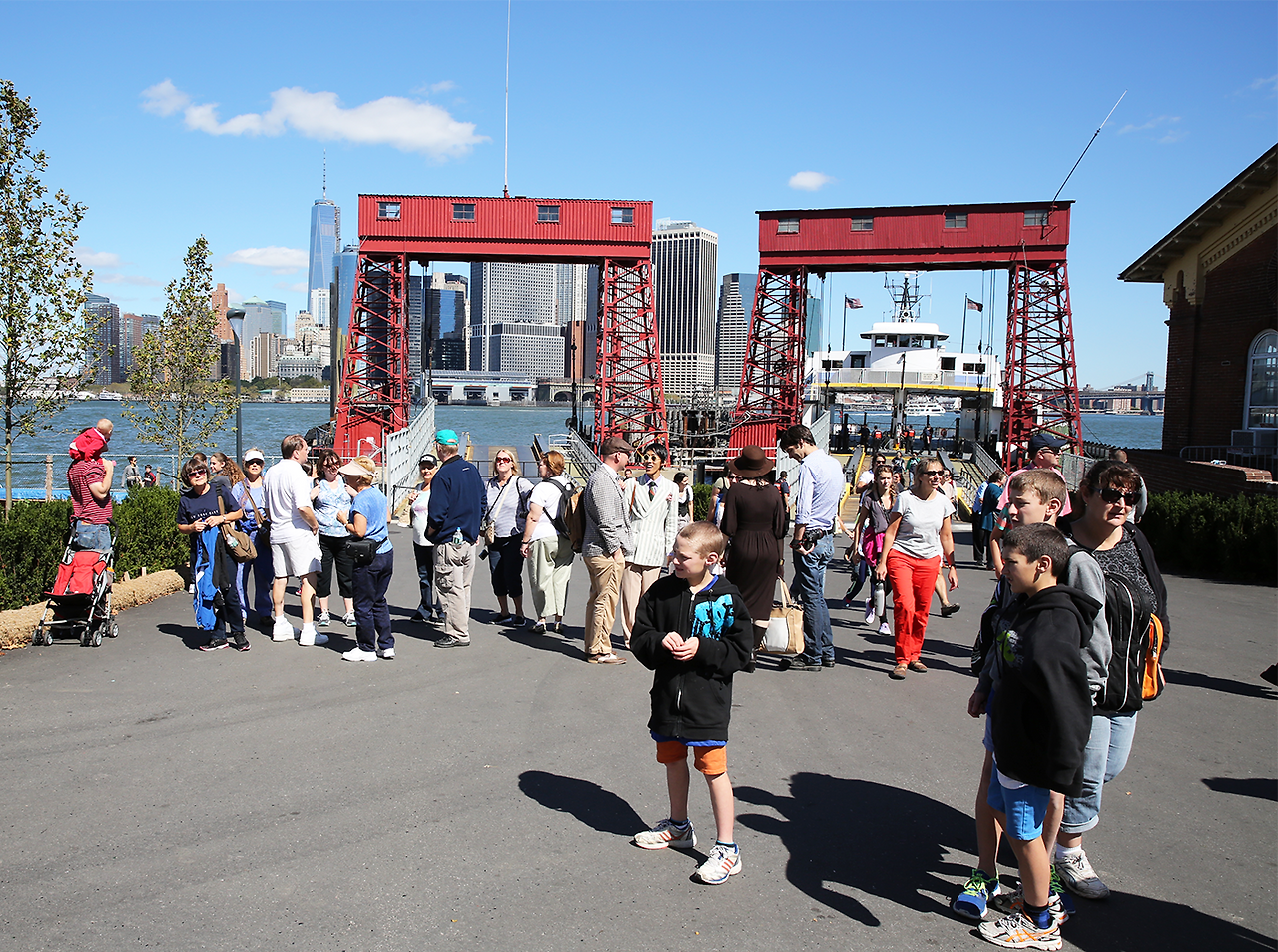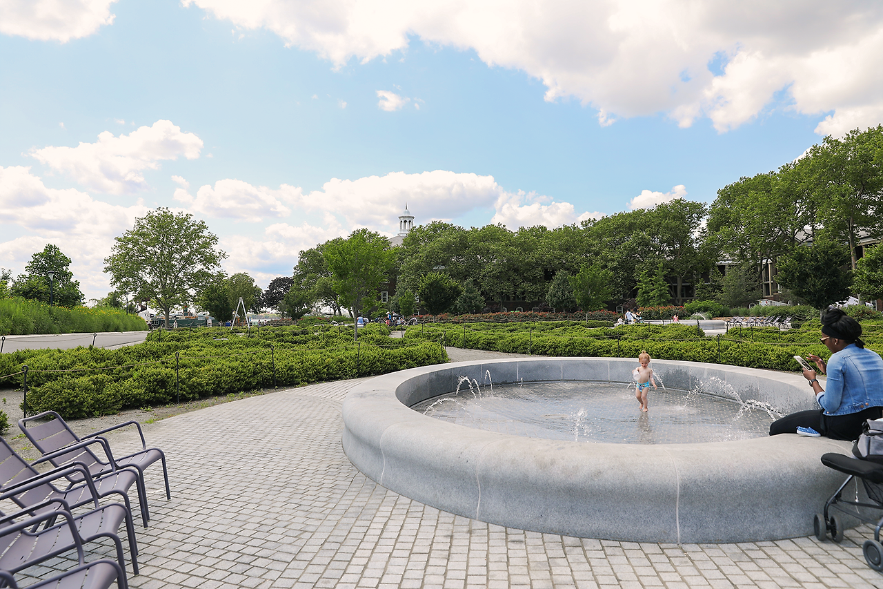 (a)페리에서 내려 (b) 로어맨해튼이 손에 잡힐 듯 가깝게 보이는 산책로를 따라 (c) 자유의여신상 뷰포인트를 방문한 뒤, 언덕(The Hillls)에 올라 맨해튼 스카이라인을 감상한다.(d) 중심부의 산책로에는 해먹과 놀이터 등 다양한 쉼터가 조성되어 있다. (e) Parade Ground로 이어지는 구역에는 옛 막사 건물들이 남아 있다.