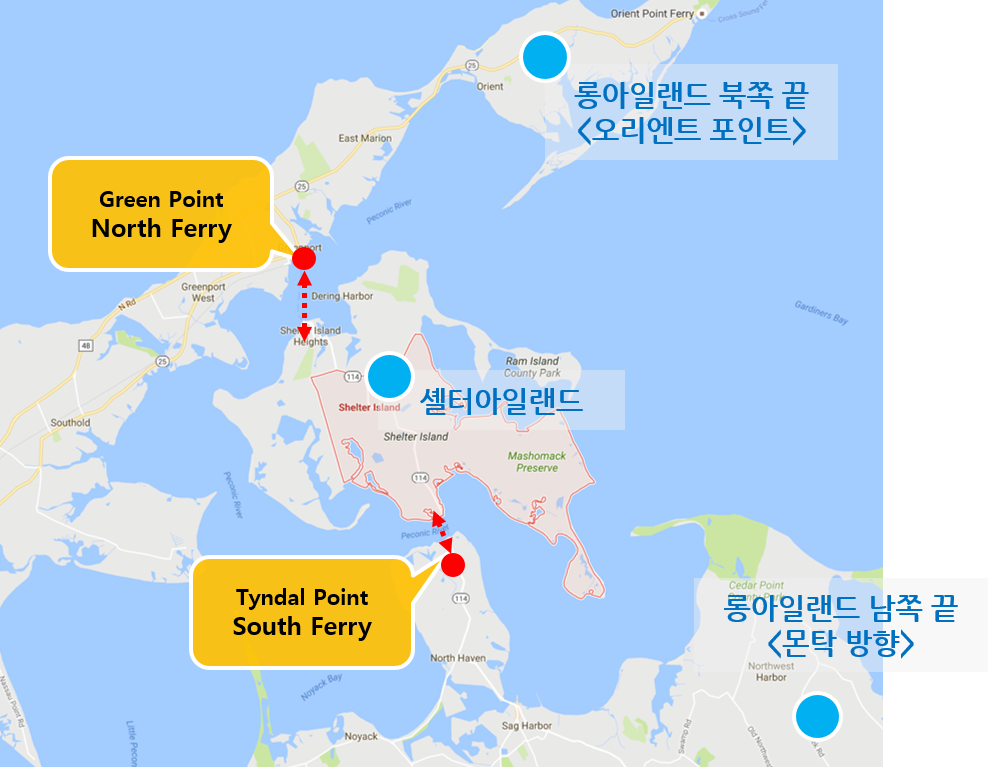 롱아일랜드 북쪽의 그린포인트 항구와, 셸터아일랜드 북쪽의 'Shelter Island Heights'를 연결하는 페리회사의 이름은 North Ferry Company (홈페이지:www.northferry.com). 이와 반대편, 롱아일랜드 남쪽과 셸터아일랜드 남쪽을 연결하는 페리회사는 South Ferry Company (홈페이지 www.southferry.com)이다.